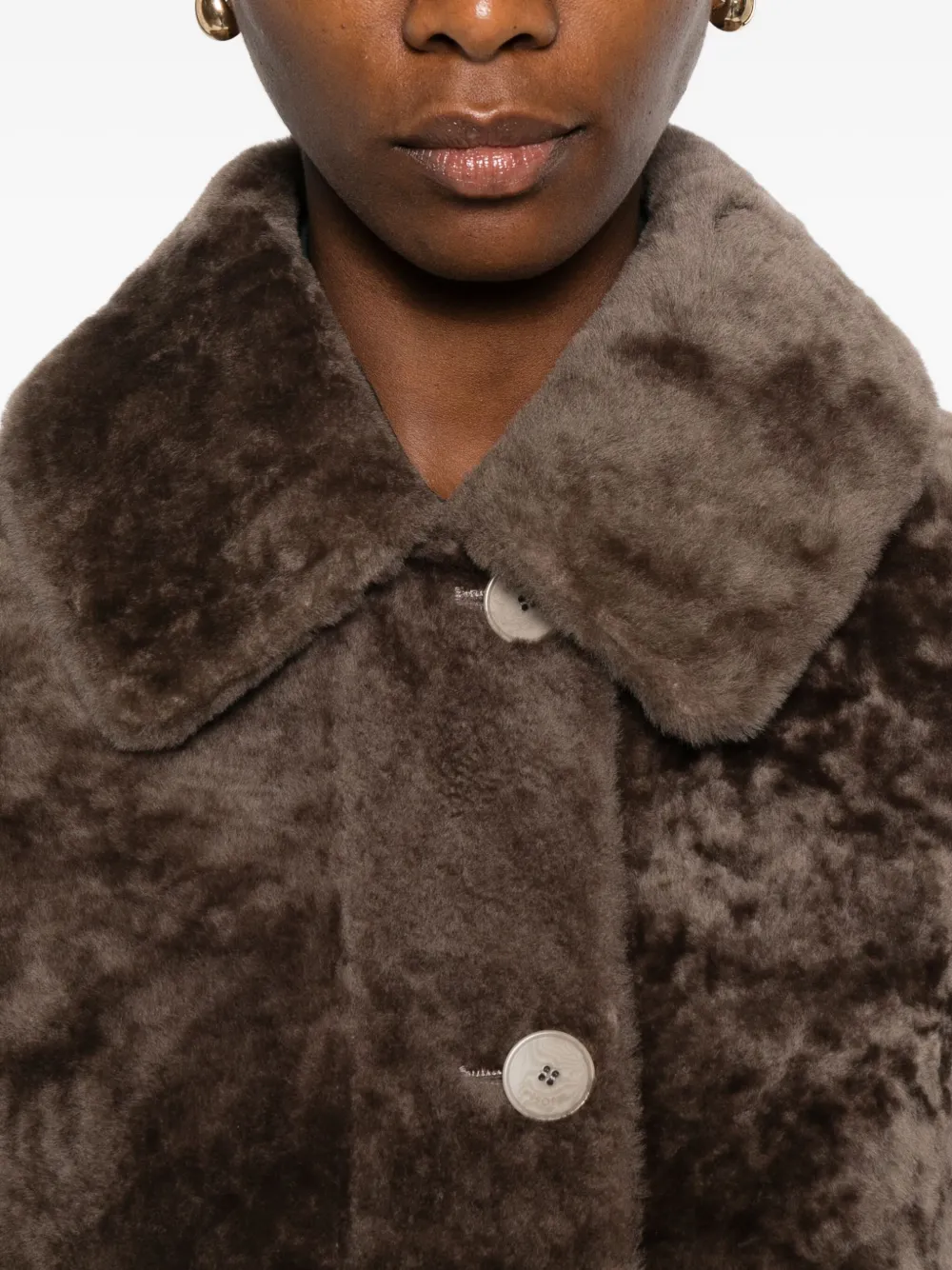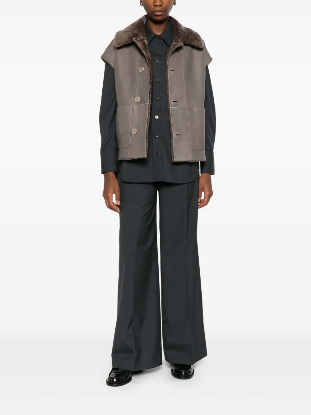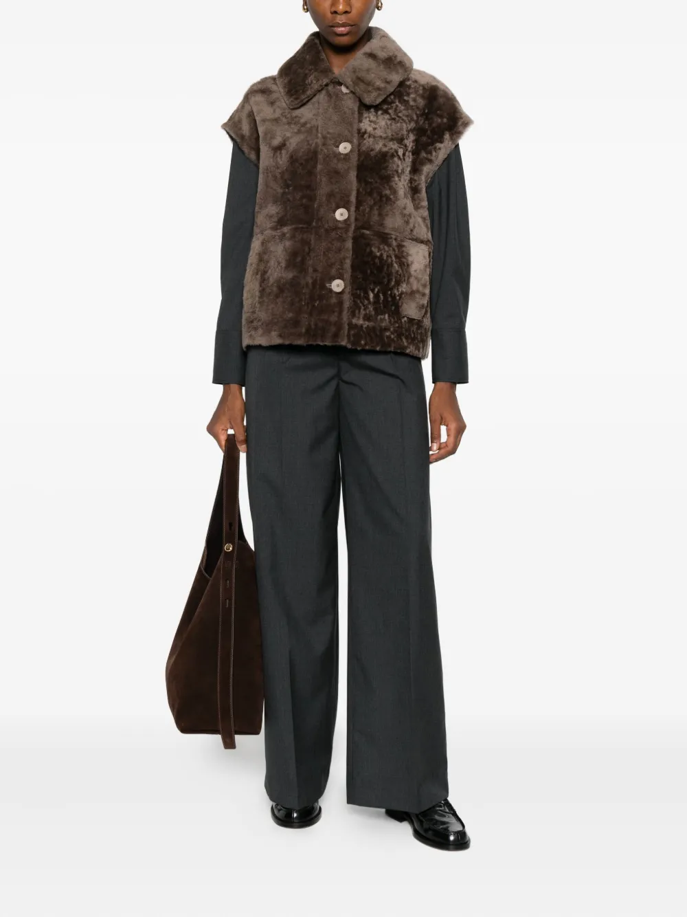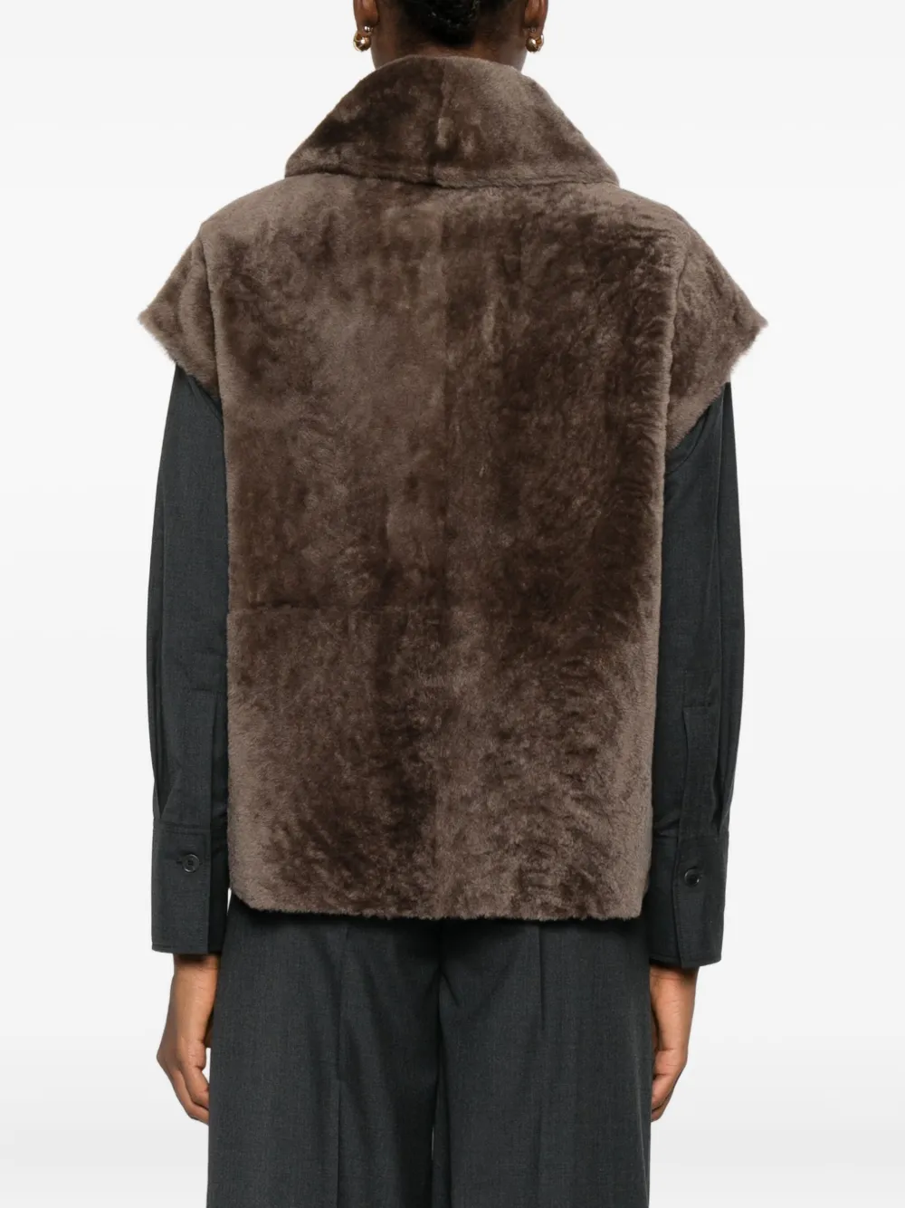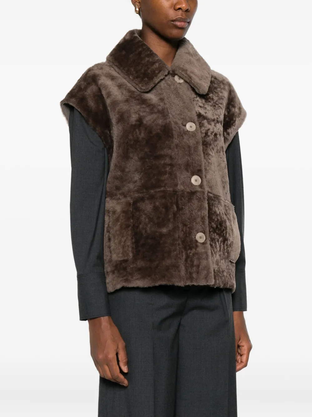 Коричневыйовчина (шеврет)застежка на пуговицах спередибез рукавовнакладные карманы по бокамдлинные рукава