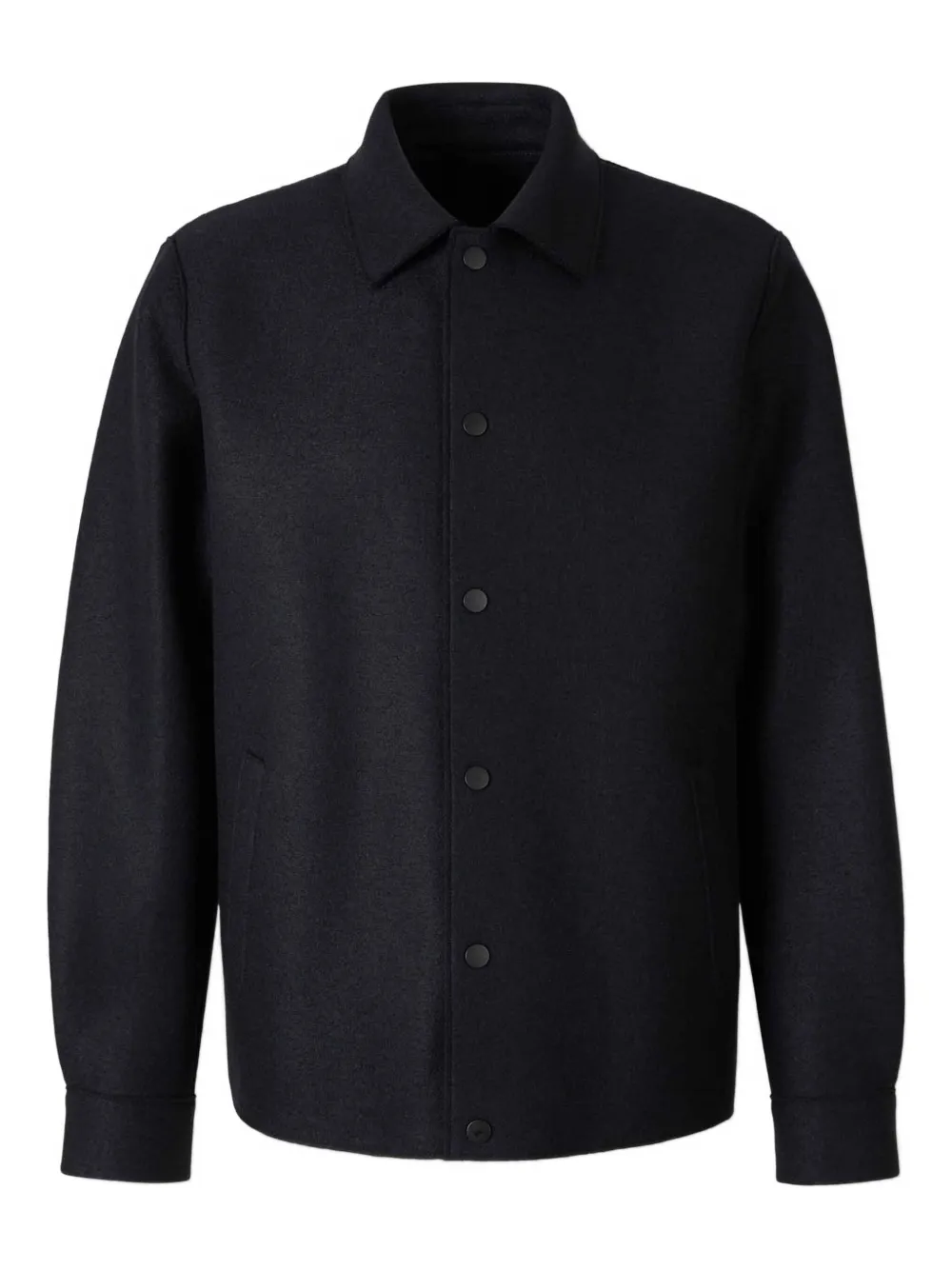 Темно-синий, шерстяная фактура, застежка на кнопках, накладные карманы, воротник поло