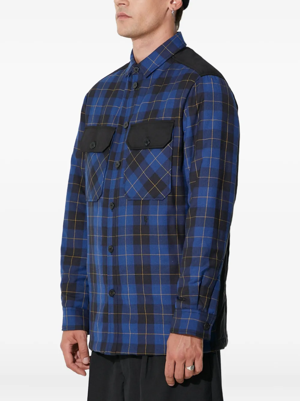 Синий и черный в клетку, застежка на пуговицы, нагрудные карманы, длинные рукава