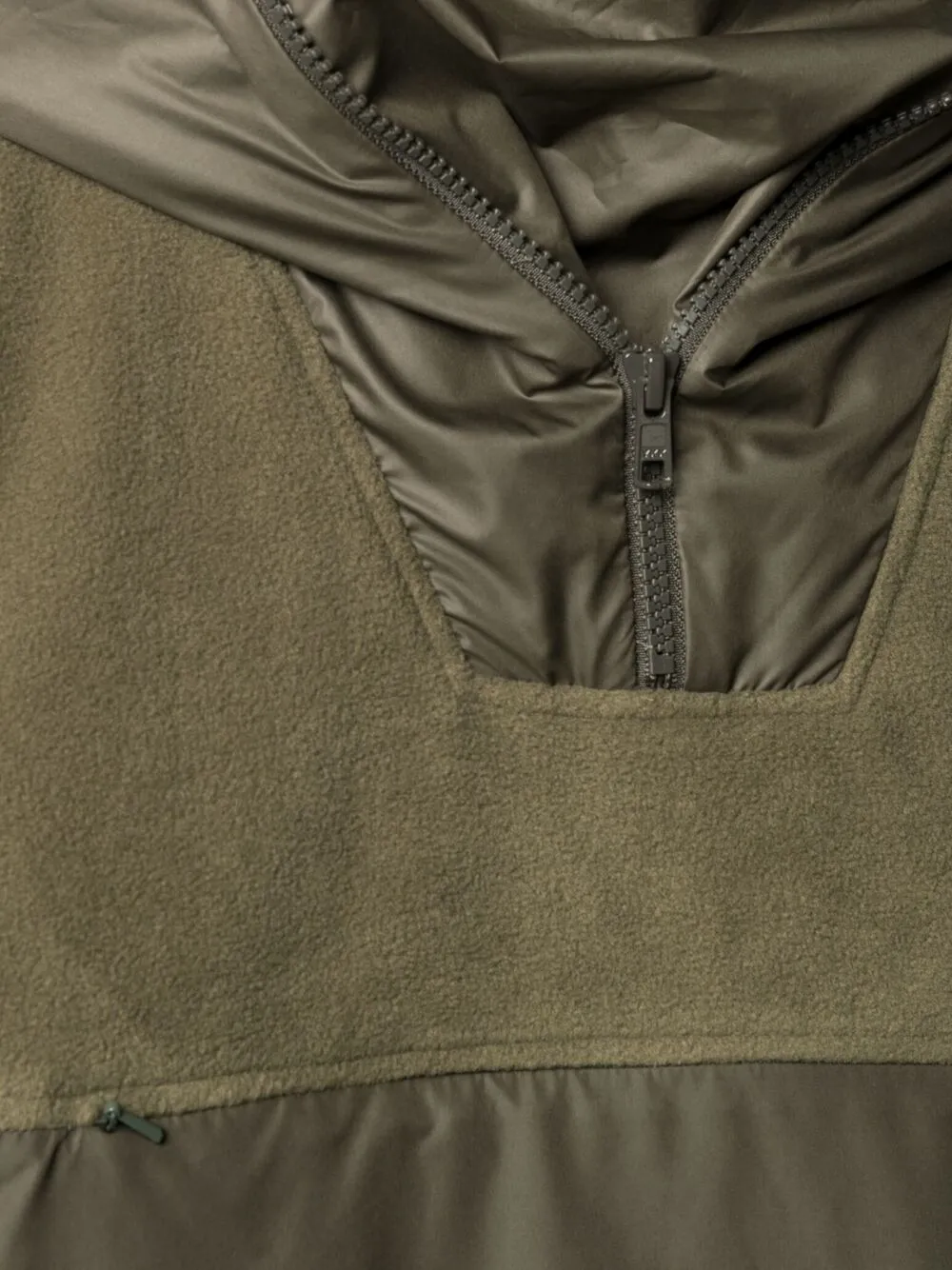 Вставки, воротник-стойка, классический капюшон, короткая застежка на молнии спереди, длинные рукава, манжеты с кулиской и прямой подол.