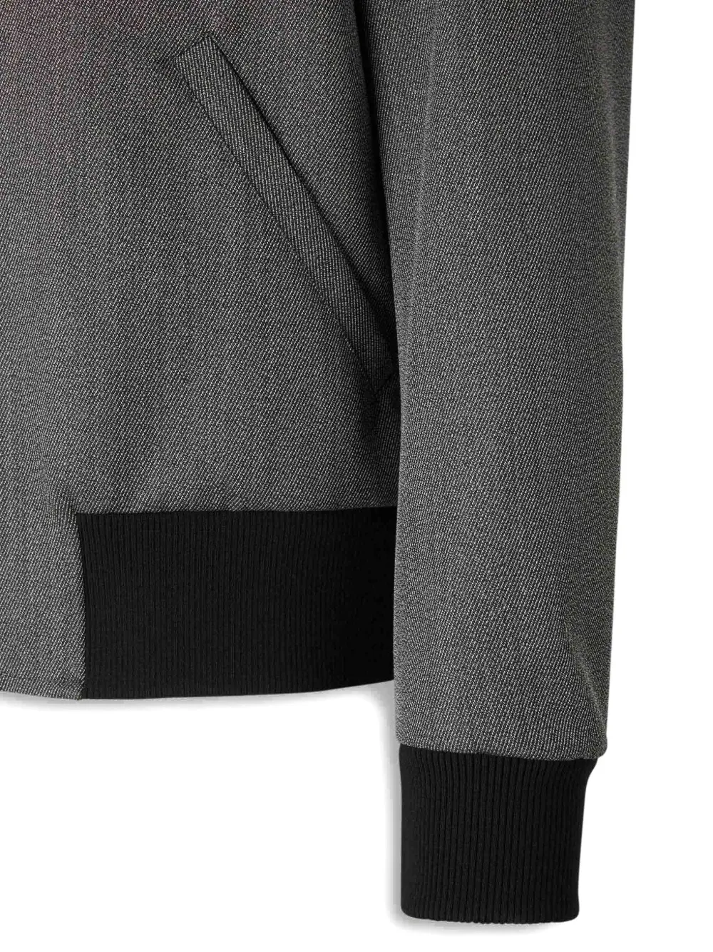 Темно-серый цвет, застежка-молния, рубчатые манжеты и пояс, прорезные карманы