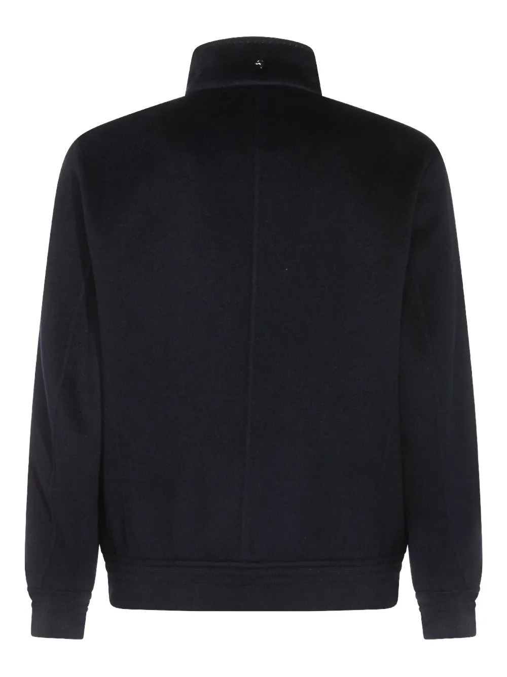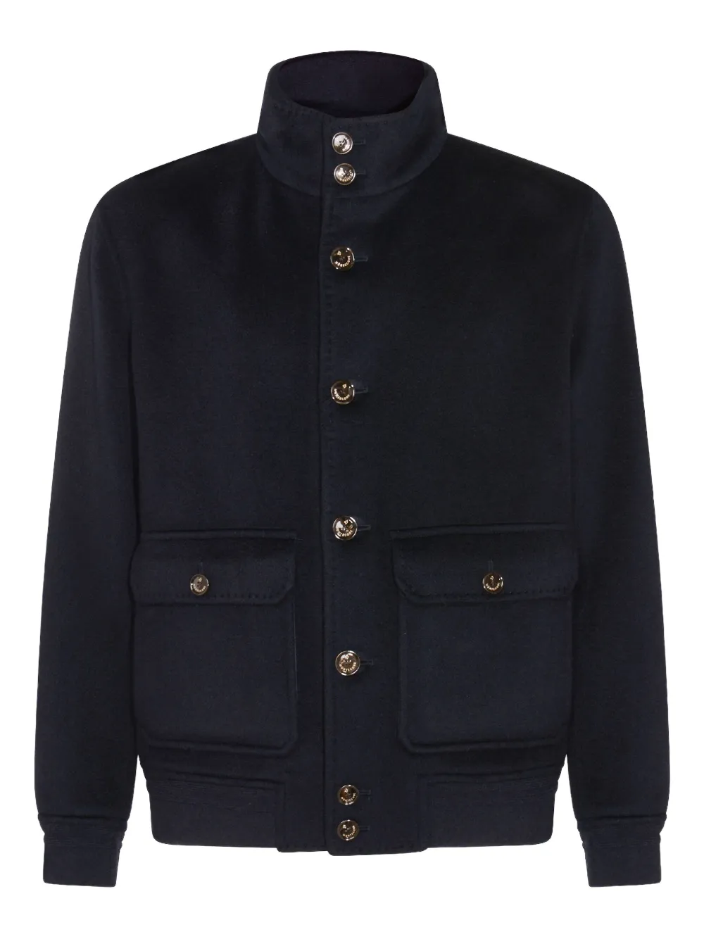 Синий цвет, стойка-воротник, застежка на пуговицы, нагрудные карманы, ребристый низ, длинные рукава