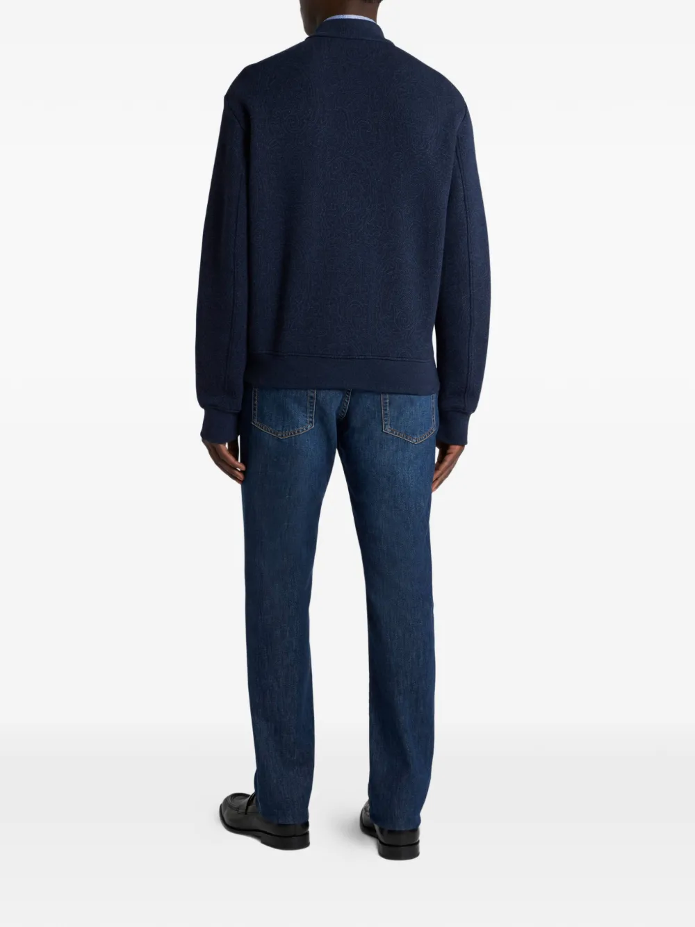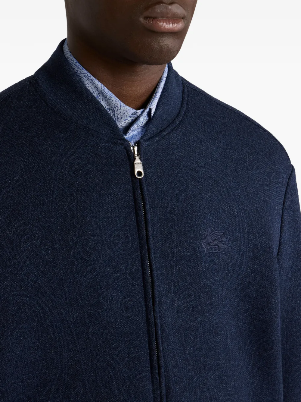 Синий жаккардовый материал, застежка-молния, ребристая отделка, боковые карманы