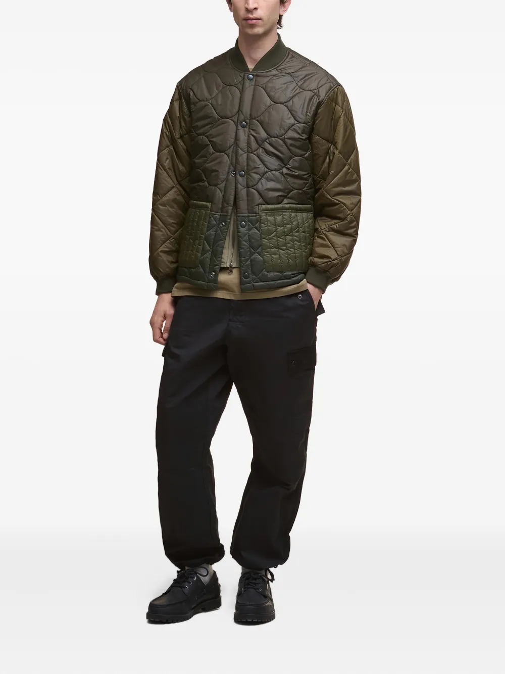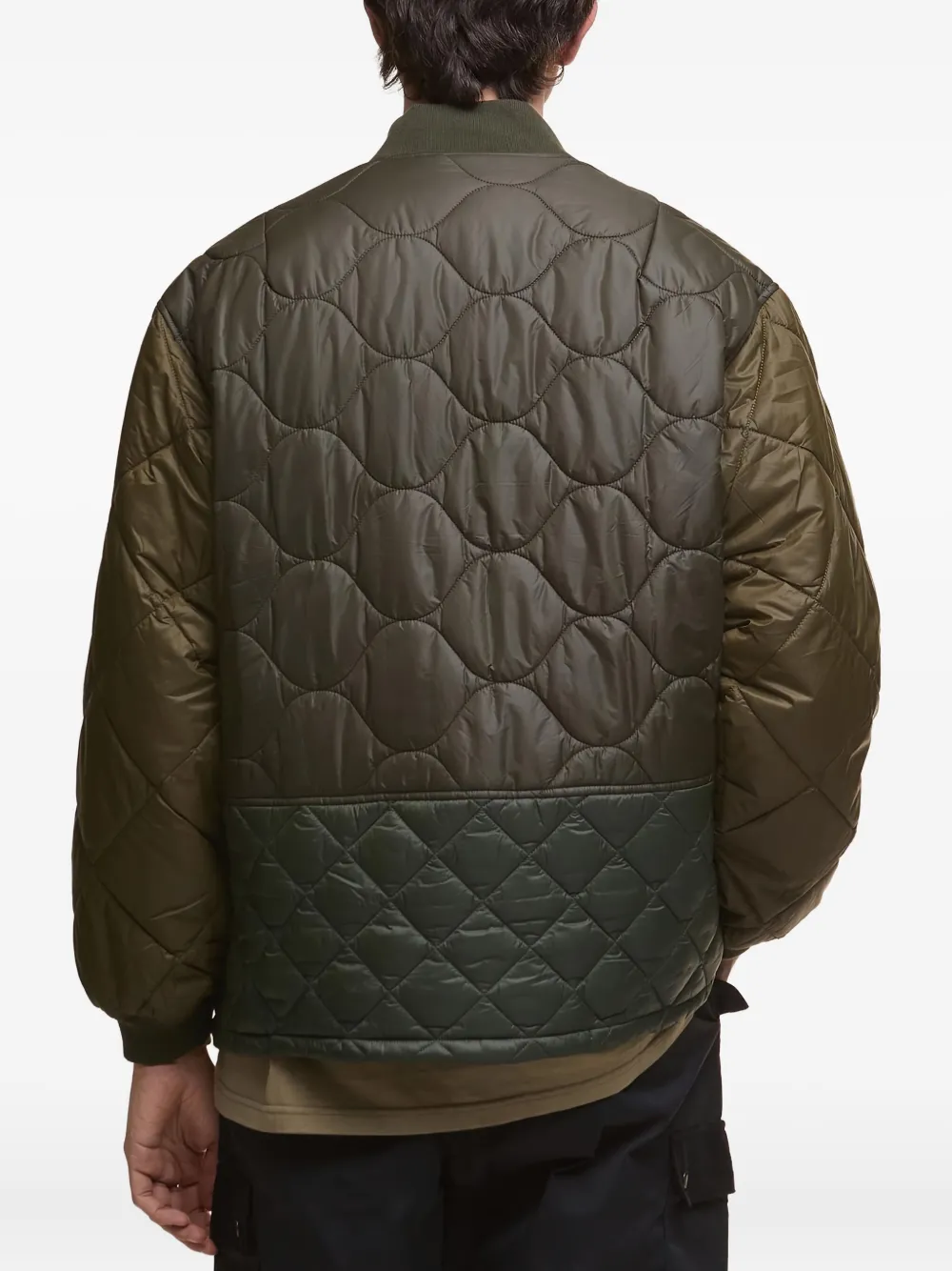 Армейский зеленый цветстеганый дизайнзастежка на кнопкахдва накладных кармана спередирубчатые манжетыворотник-стойка в рубчик