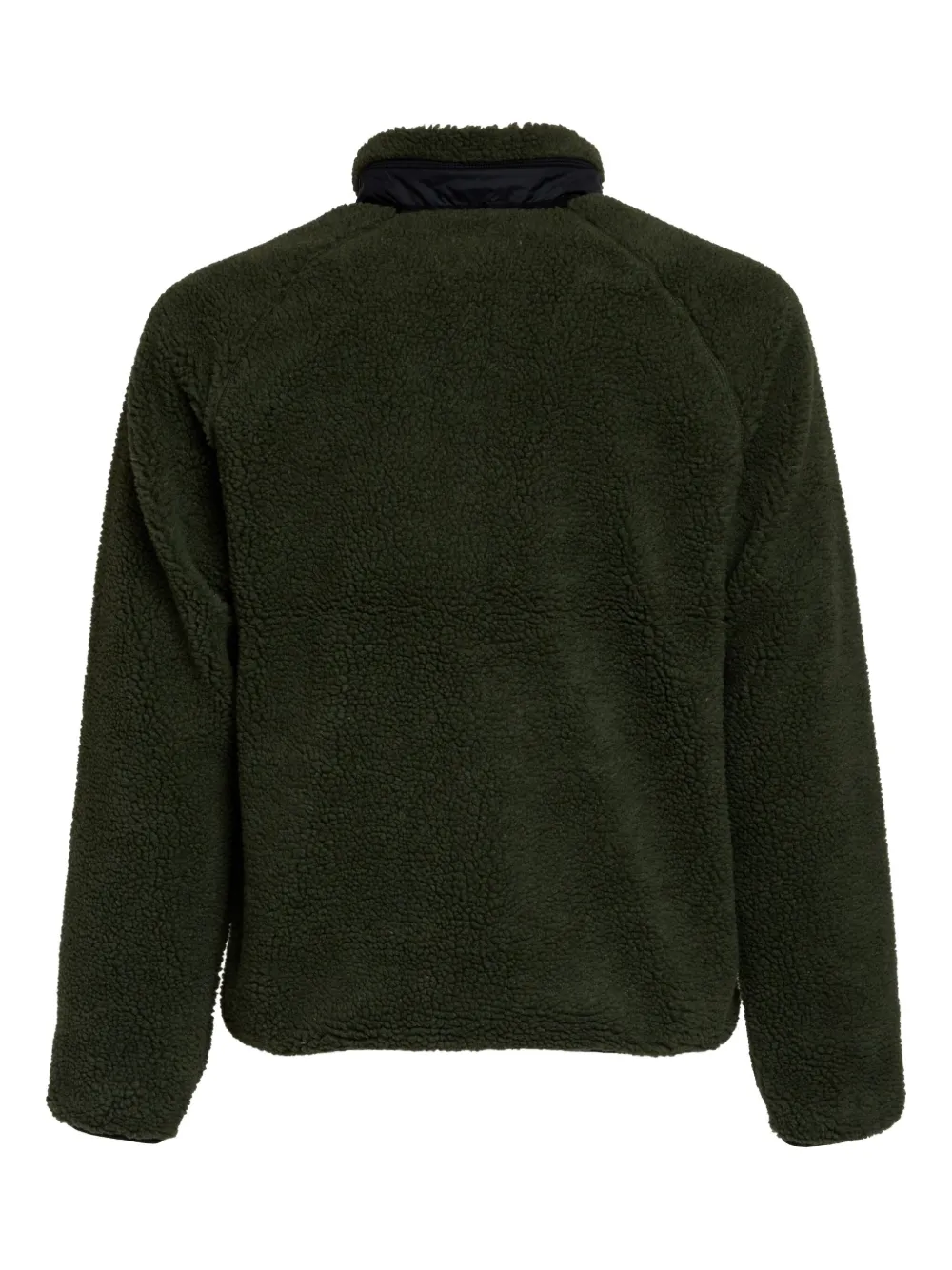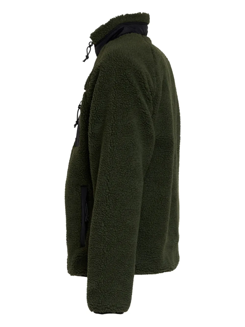 Темно-зеленая ворсистая текстура, застежка-молния, нагрудный карман, боковые карманы