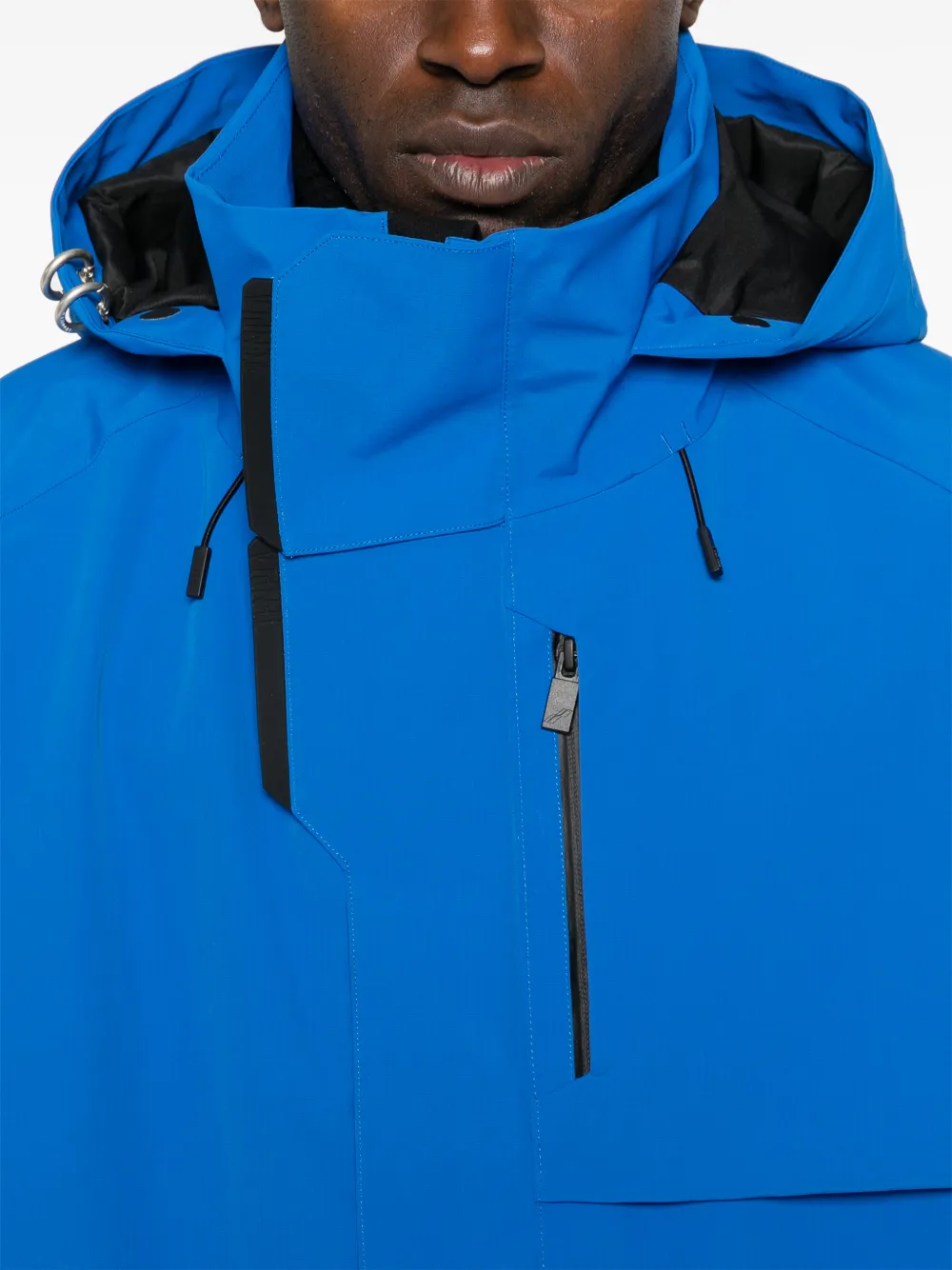 Синий, серебристые детали, несколько карманов, застежка на молнию спереди, капюшон, длинные рукава
