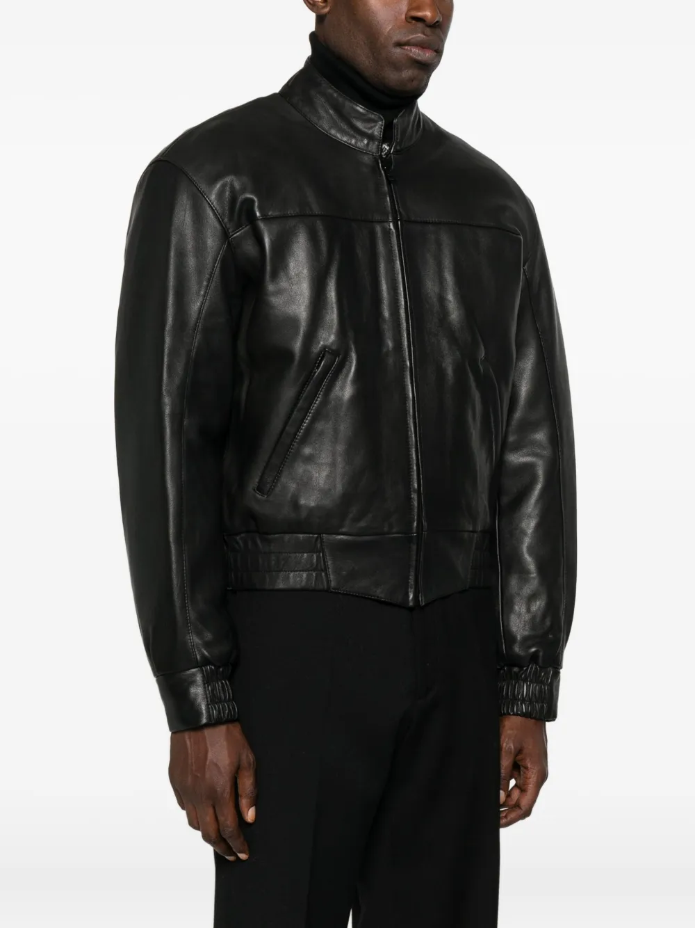 Черный кожа застежка-молния спереди эластичные манжеты прорезные карманы стоячий воротник