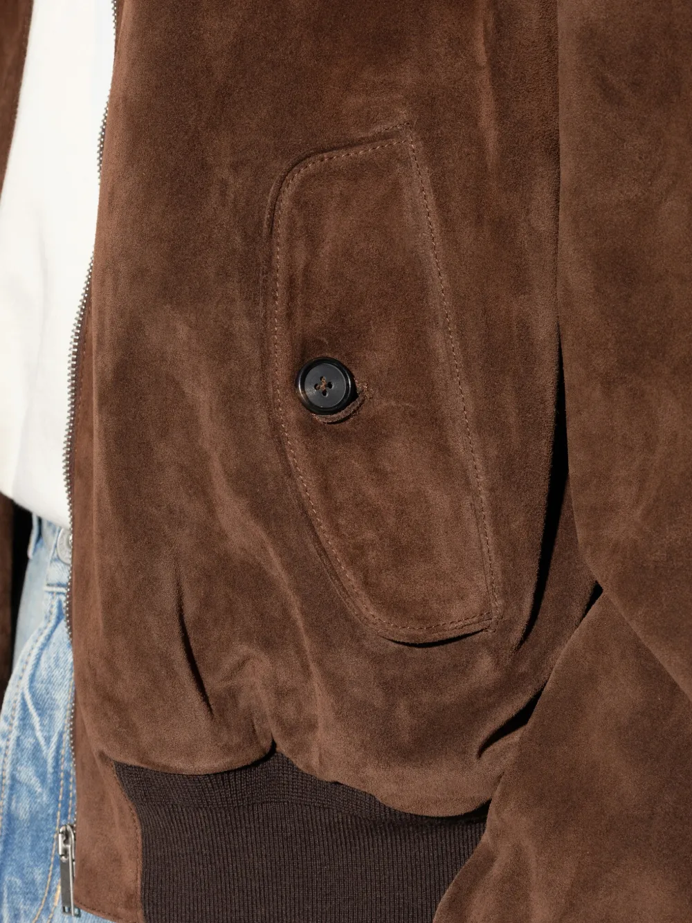 Коричневая замша, застежка-молния, накладные карманы с клапанами на пуговице, отложной воротник, ребристый низ