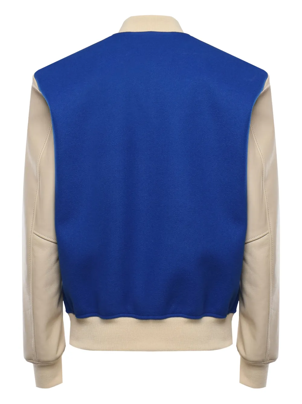 Синие кожаные рукава на кнопках, ребристый воротник, манжеты и пояс, боковые карманы, логотип