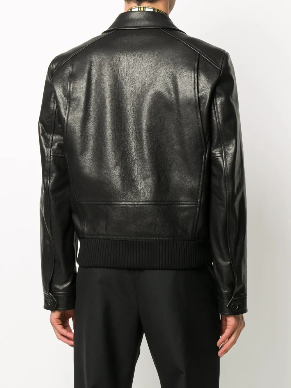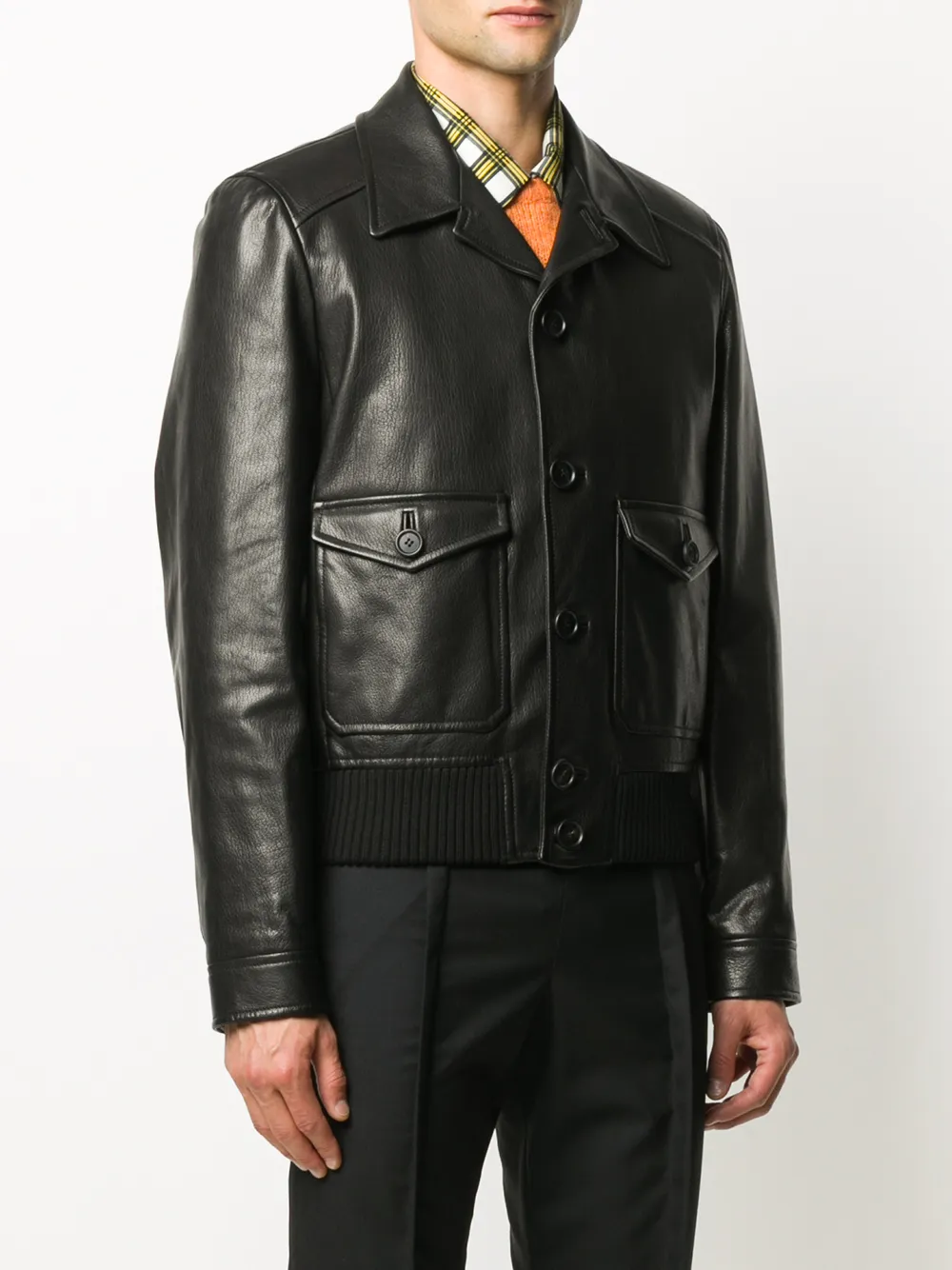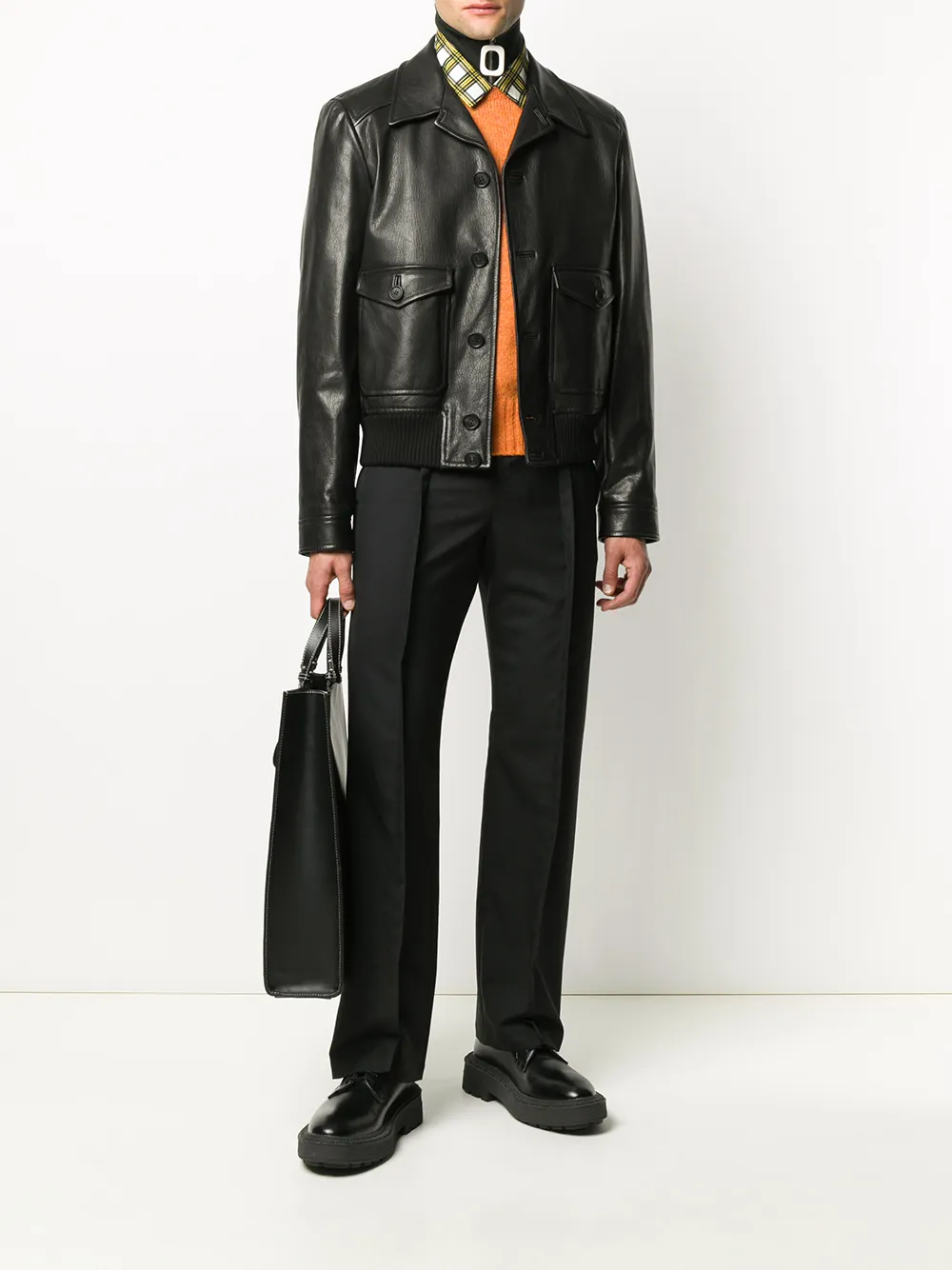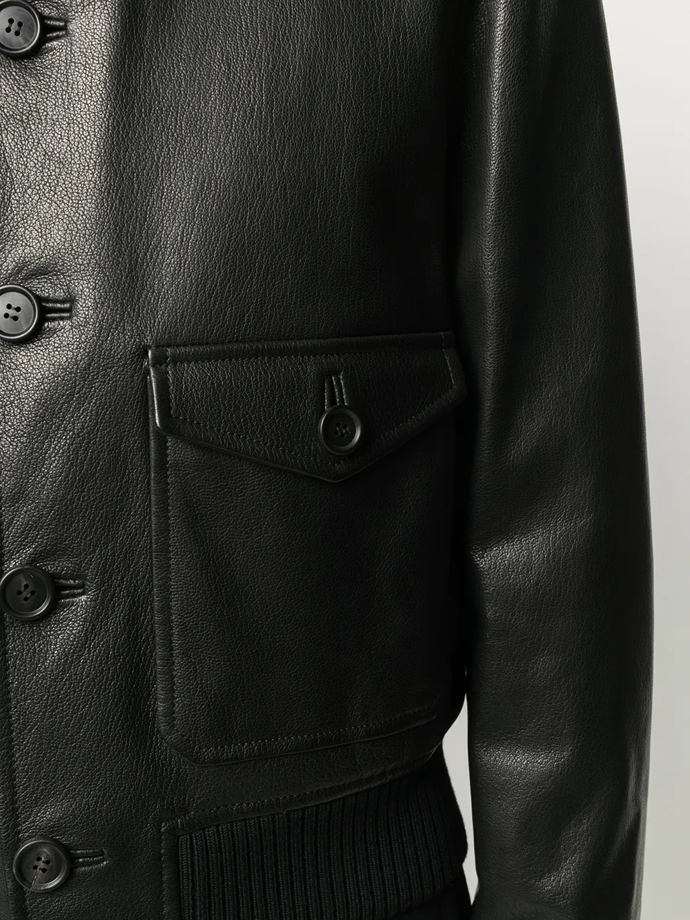 Вязаные края в рубчик, косой воротник, застежка на пуговицах спереди, длинные рукава и два передних кармана с клапанами. Цвет: черный.