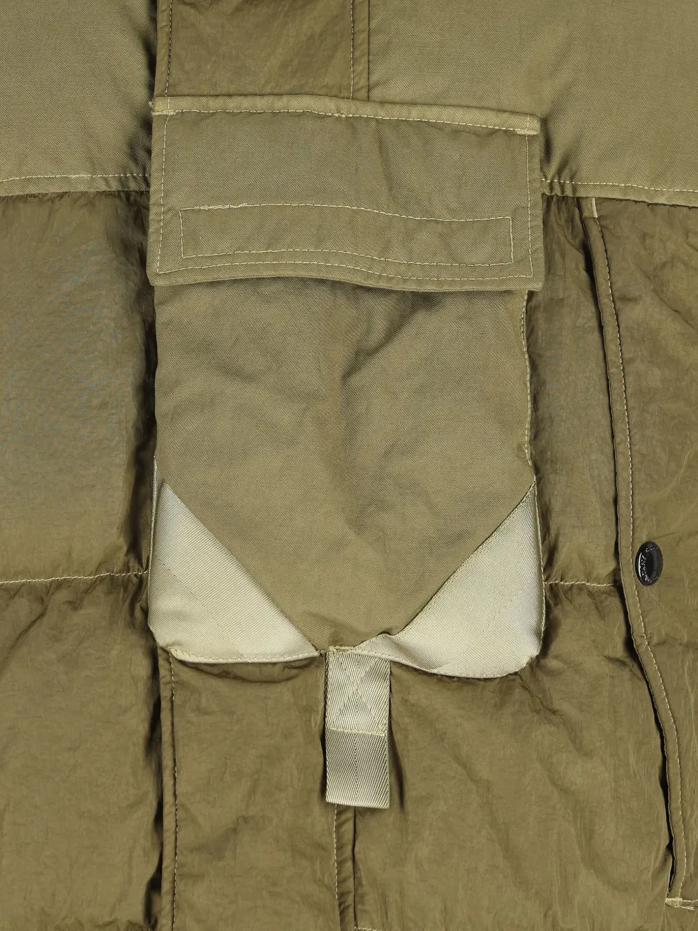 Зеленый цвет, горизонтальная стежка, регулируемый капюшон, высокий воротник, застежка-молния по всей длине, нагрудный карман с клапаном, манжеты в рубчик