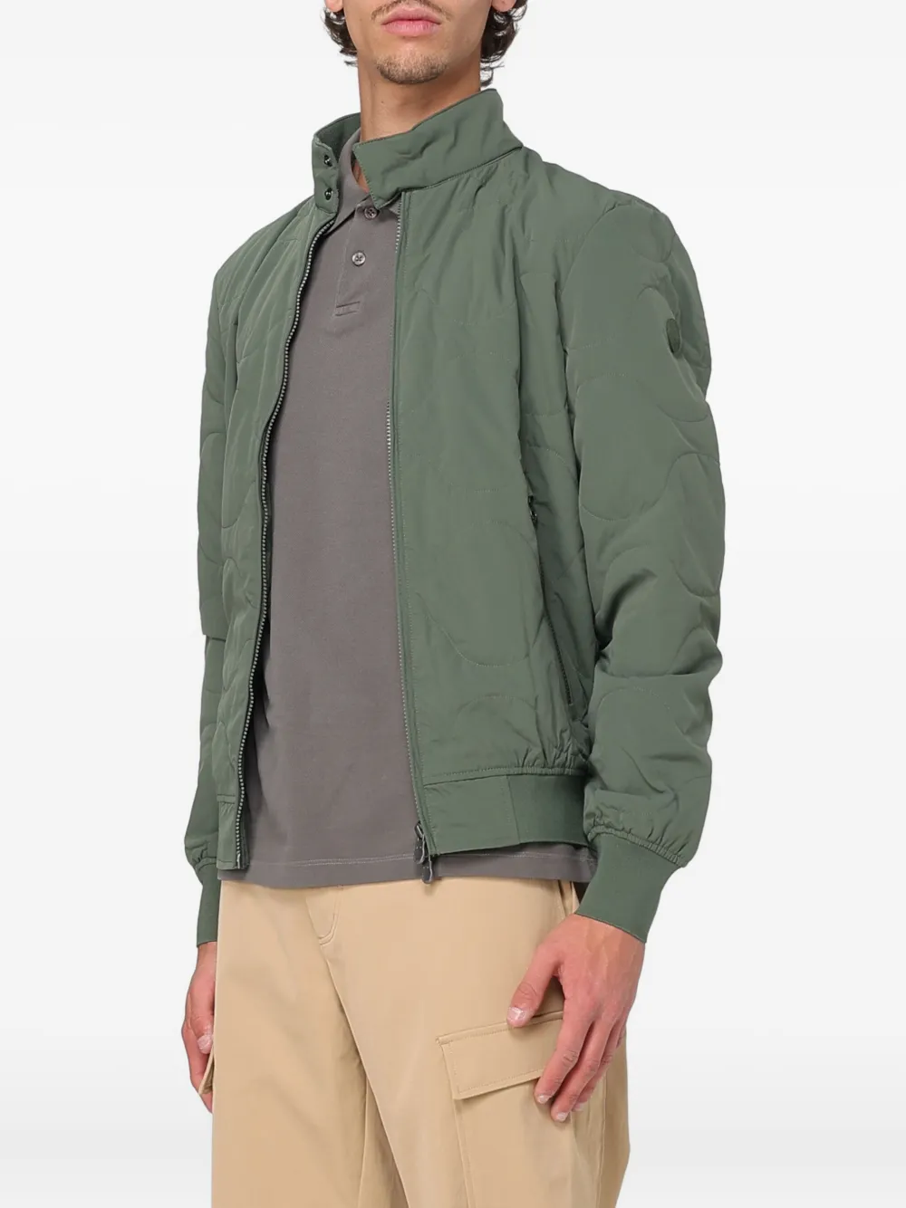 Зеленый стеганый с застежкой-молнией, ребристыми манжетами и подолом, высоким воротом