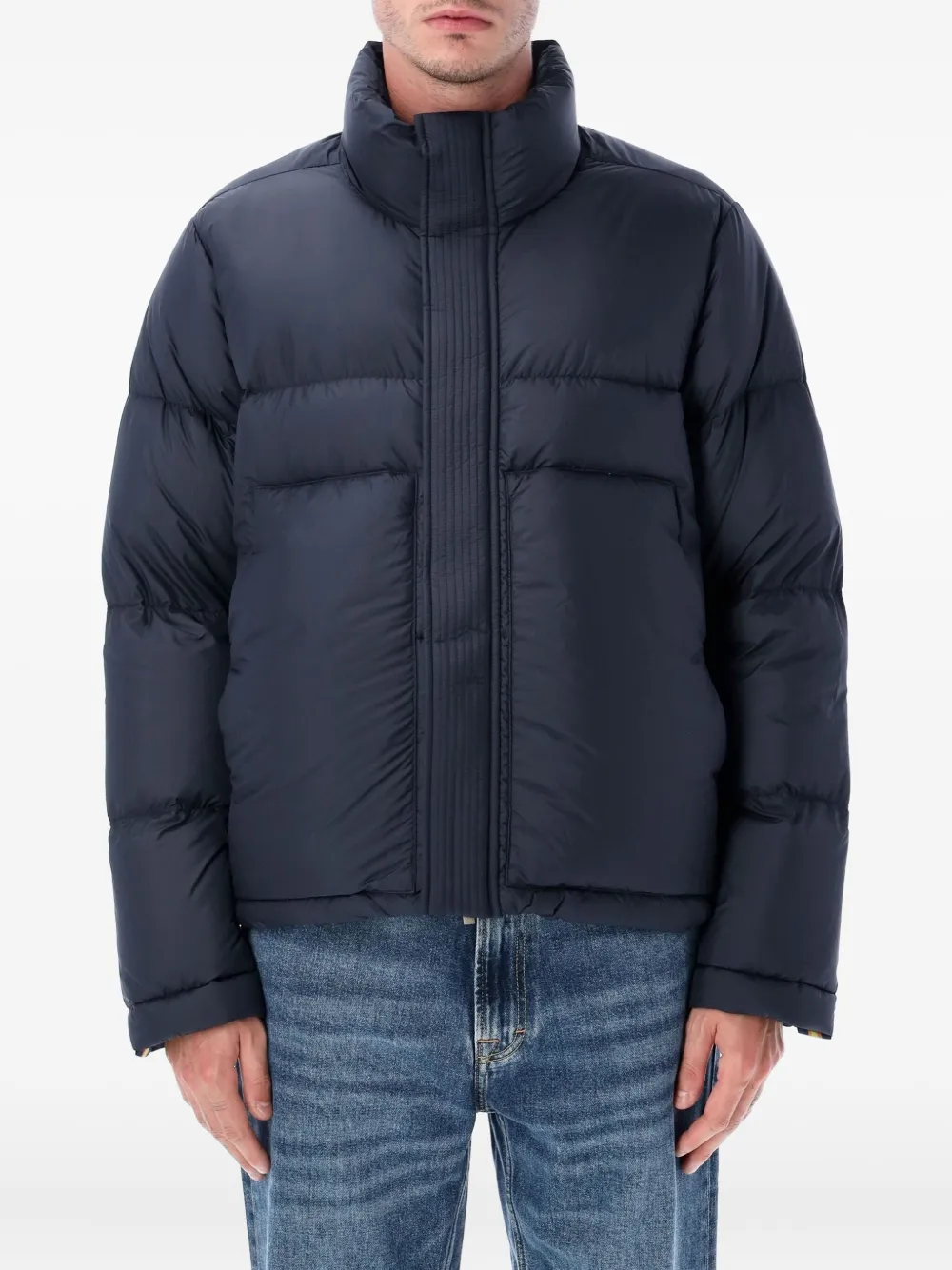 Глубокий синий цвет, стеганый дизайн, высокий воротник, застежка-молния спереди, застежка на кнопки, боковые карманы