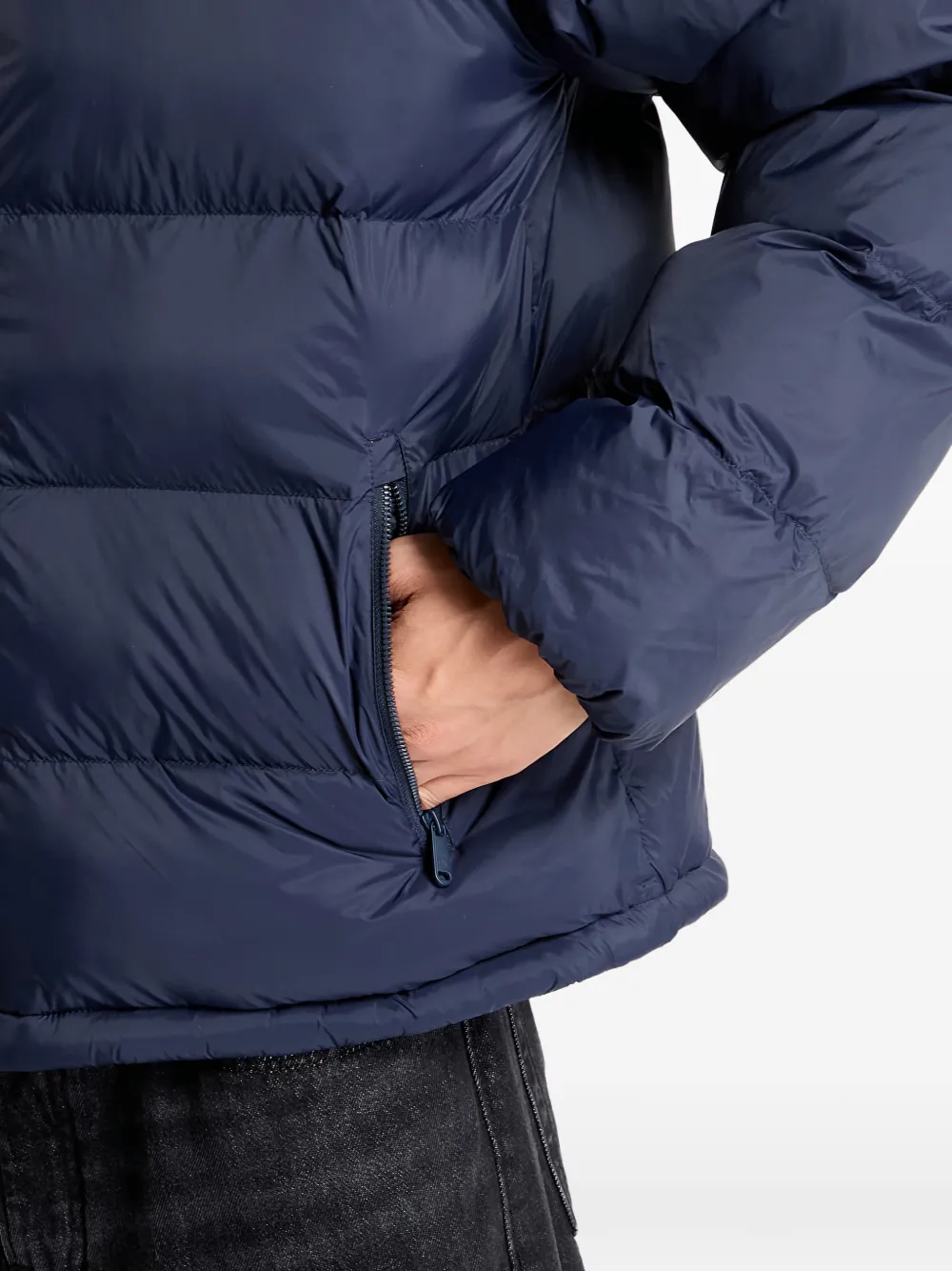 Синий с монограммой, капюшон на шнурке, застежка-молния, боковые карманы на молнии, длинные рукава