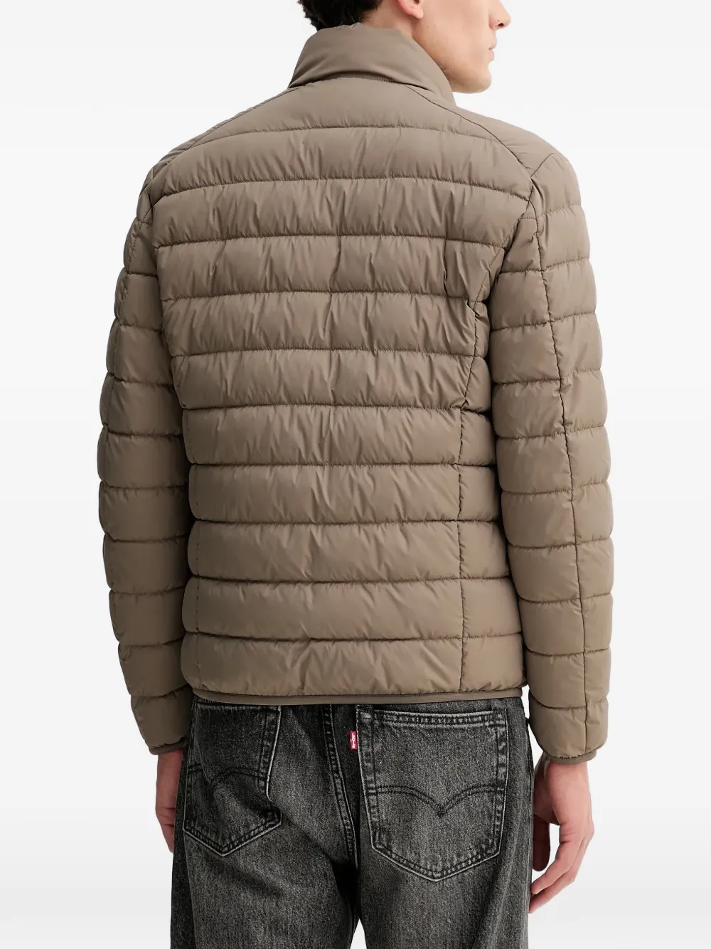 Светло-коричневая стеганая куртка на молнии с высоким воротником, длинными рукавами и боковыми карманами на молнии
