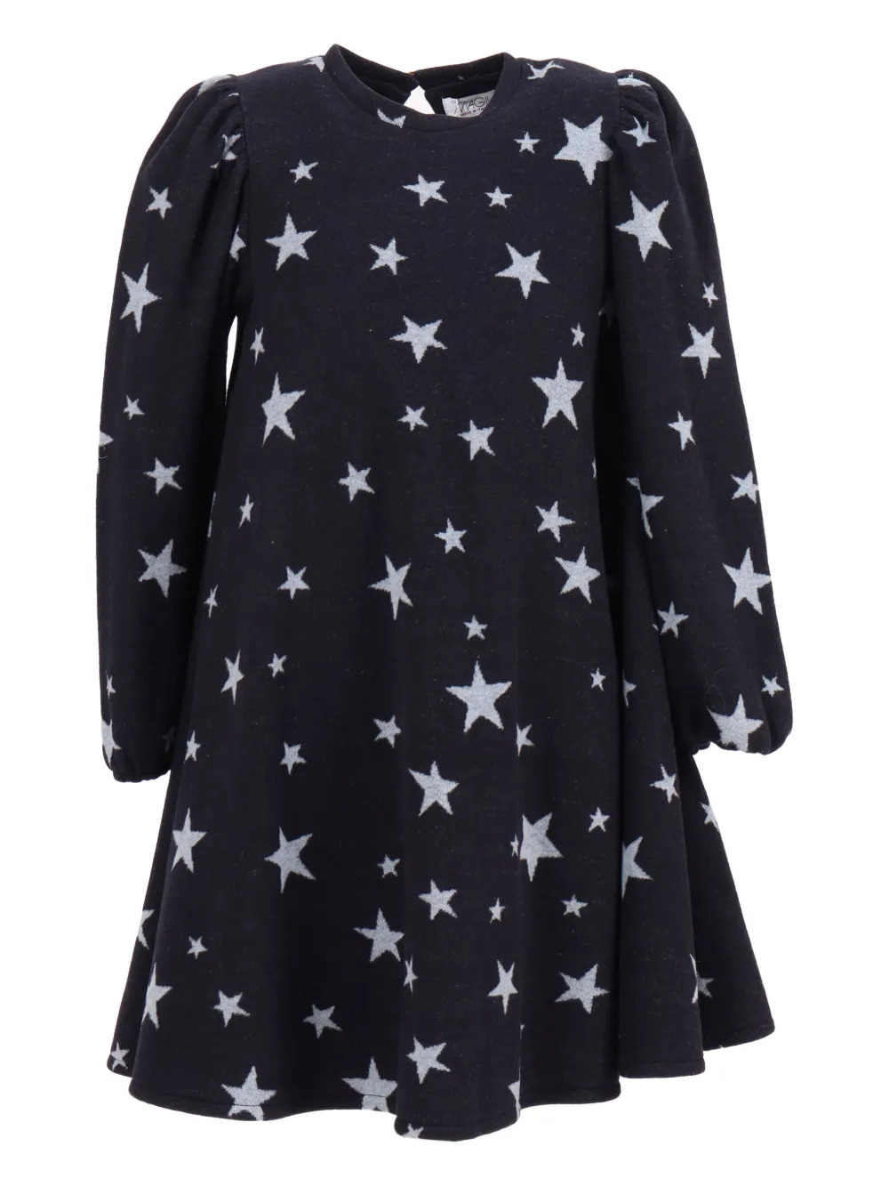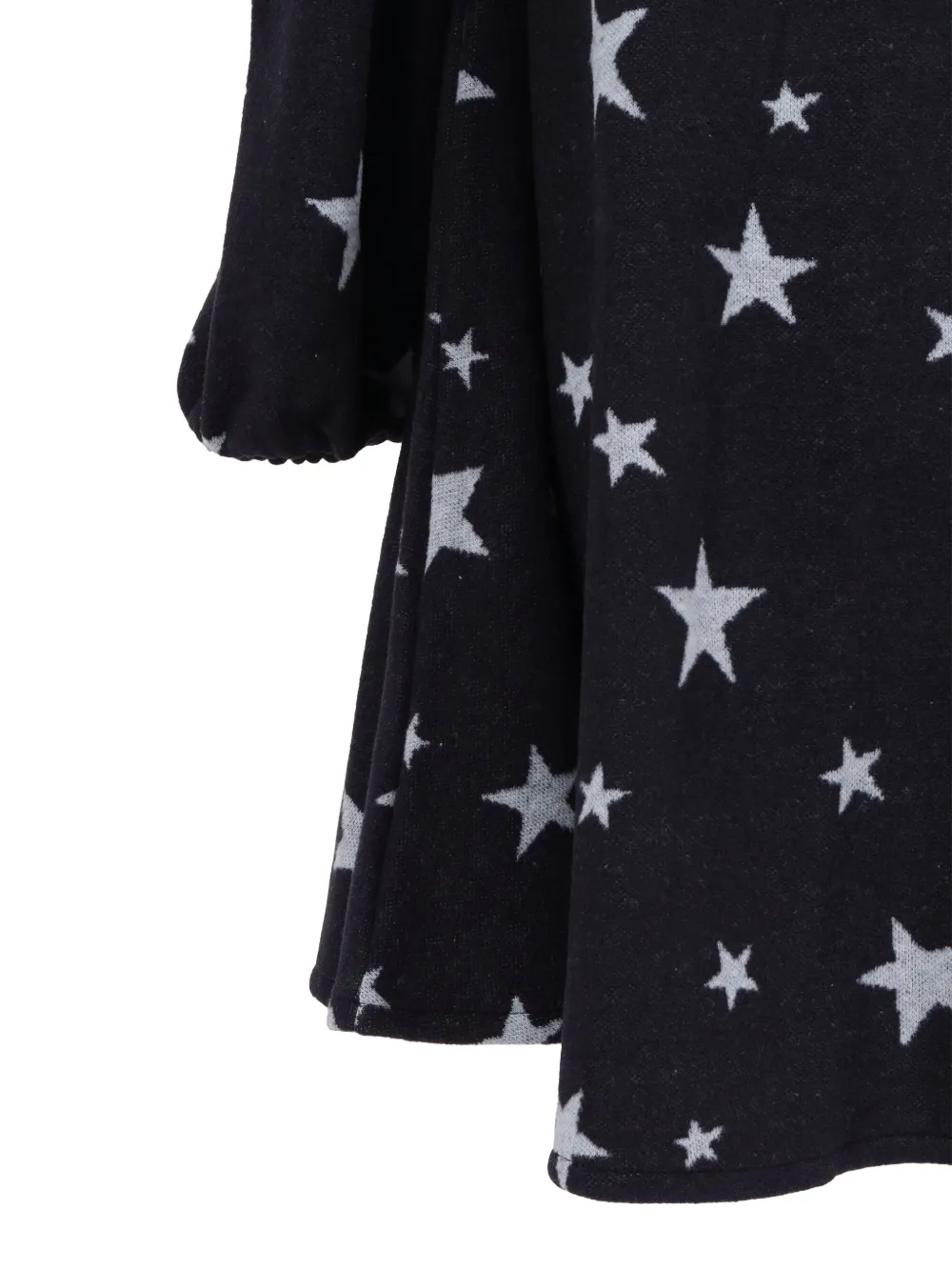 Темно-синее платье с узором в виде звезд, длинными рукавами, круглым вырезом, разрезом-каплей сзади и расклешенной юбкой