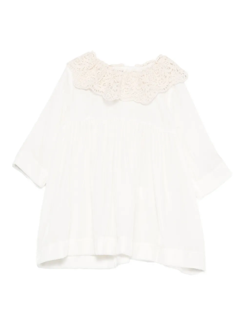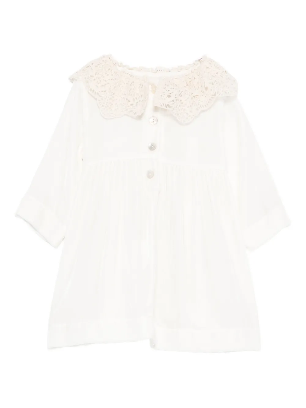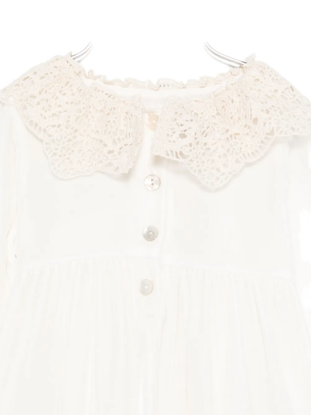 Белый вязаный крючком воротник, застежка на пуговицы, длинные рукава, присборенные детали