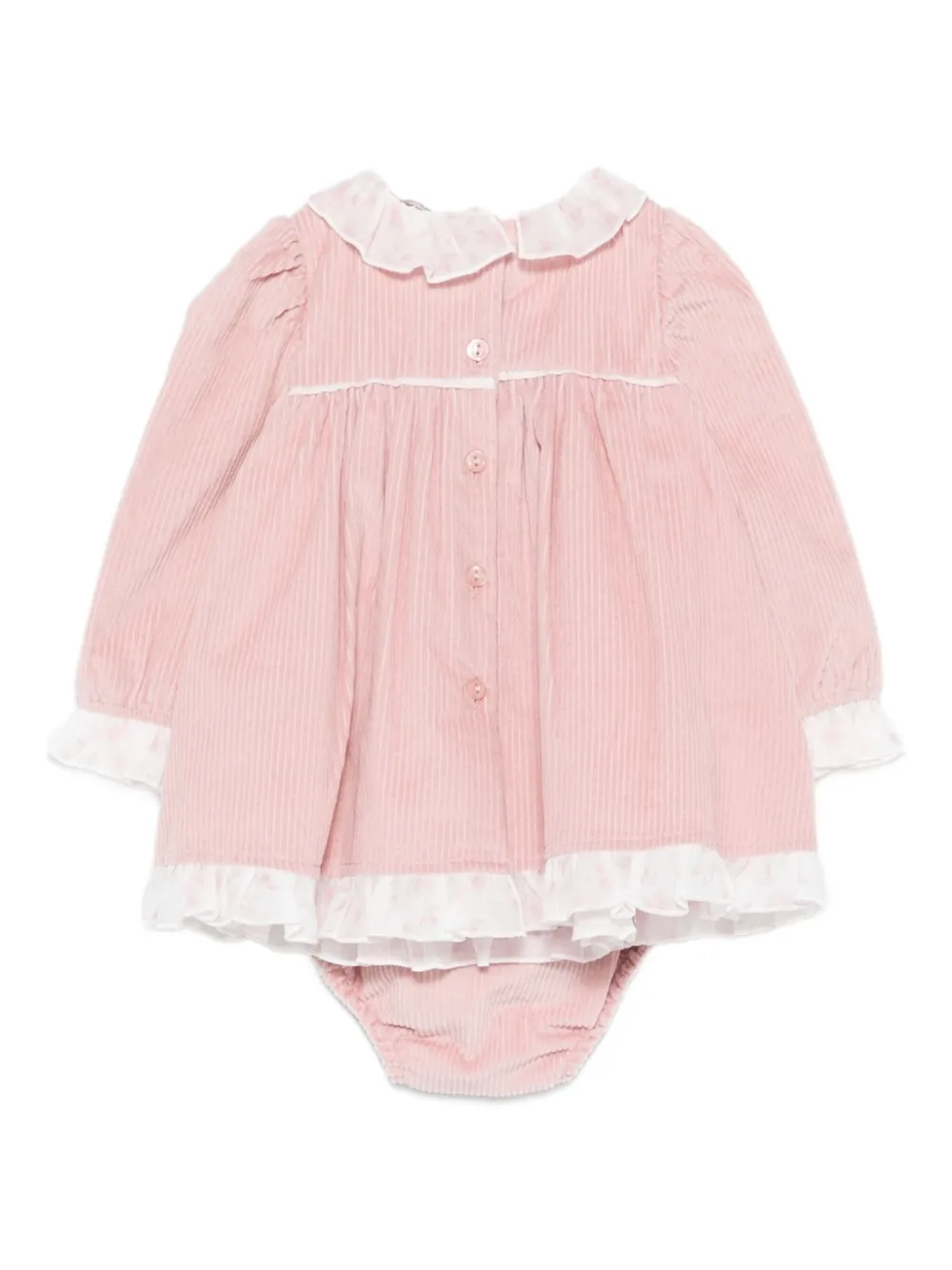 Розовый вельвет воротник с рюшами вышитый медвежонок застежка на пуговицы сзади