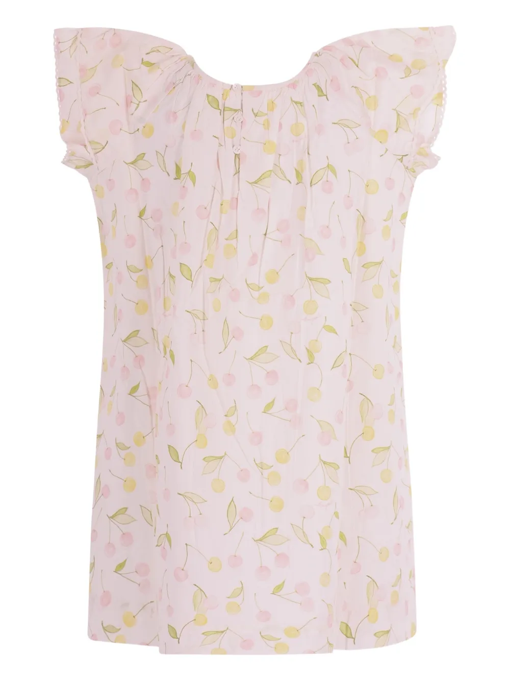 Светло-розовый цвет, вишневый принт, рукава с рюшами, застежка на пуговицы, сборка, отделка кружевом