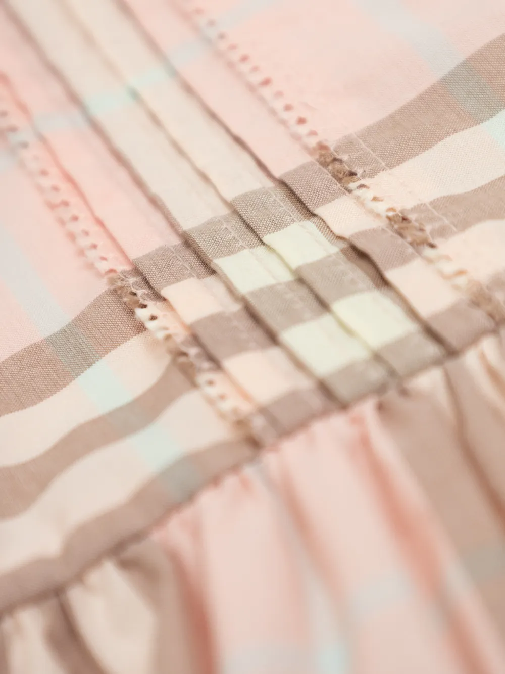 Розовый в клетку, с воротником, короткими рукавами, присборенной деталью и складками