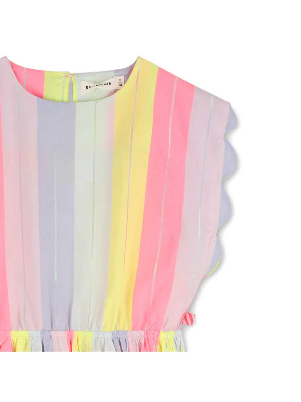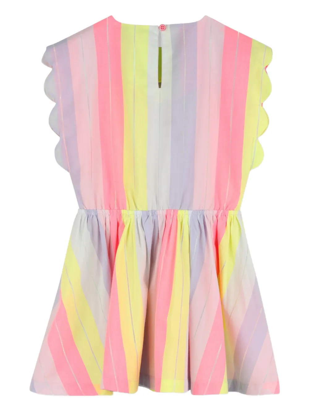 Розовое и разноцветное платье в вертикальную полоску с волнистыми краями, собранной талией и без рукавов