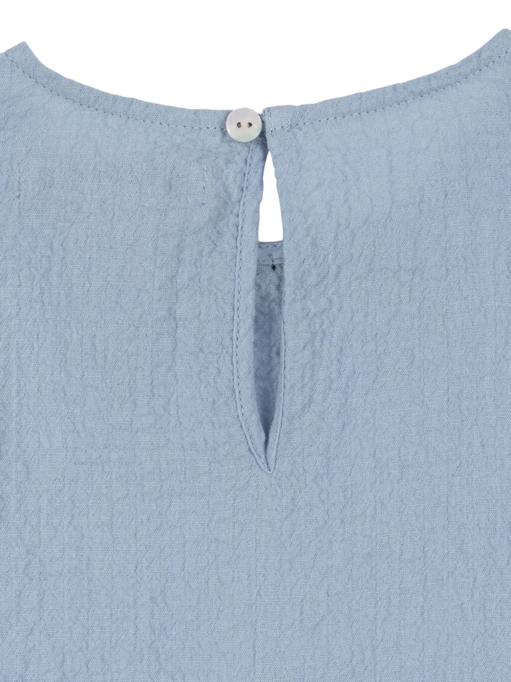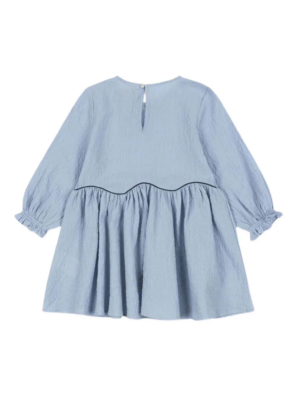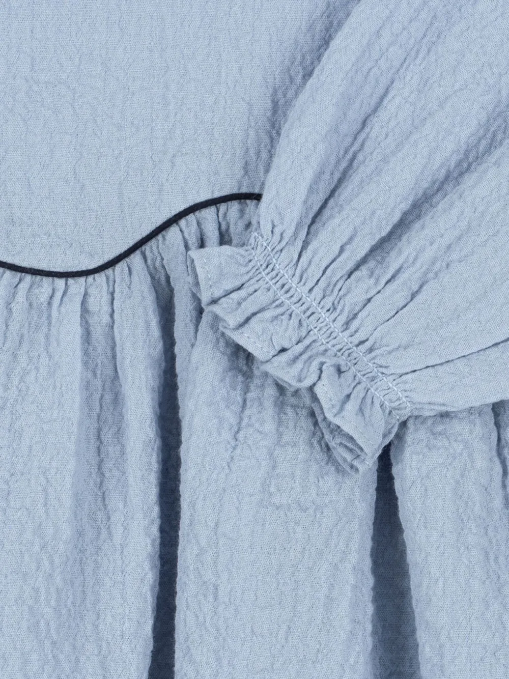 Голубой туман, текстурированная отделка, бант, рукава с оборками, застежка на пуговицы сзади, волнистая отделка