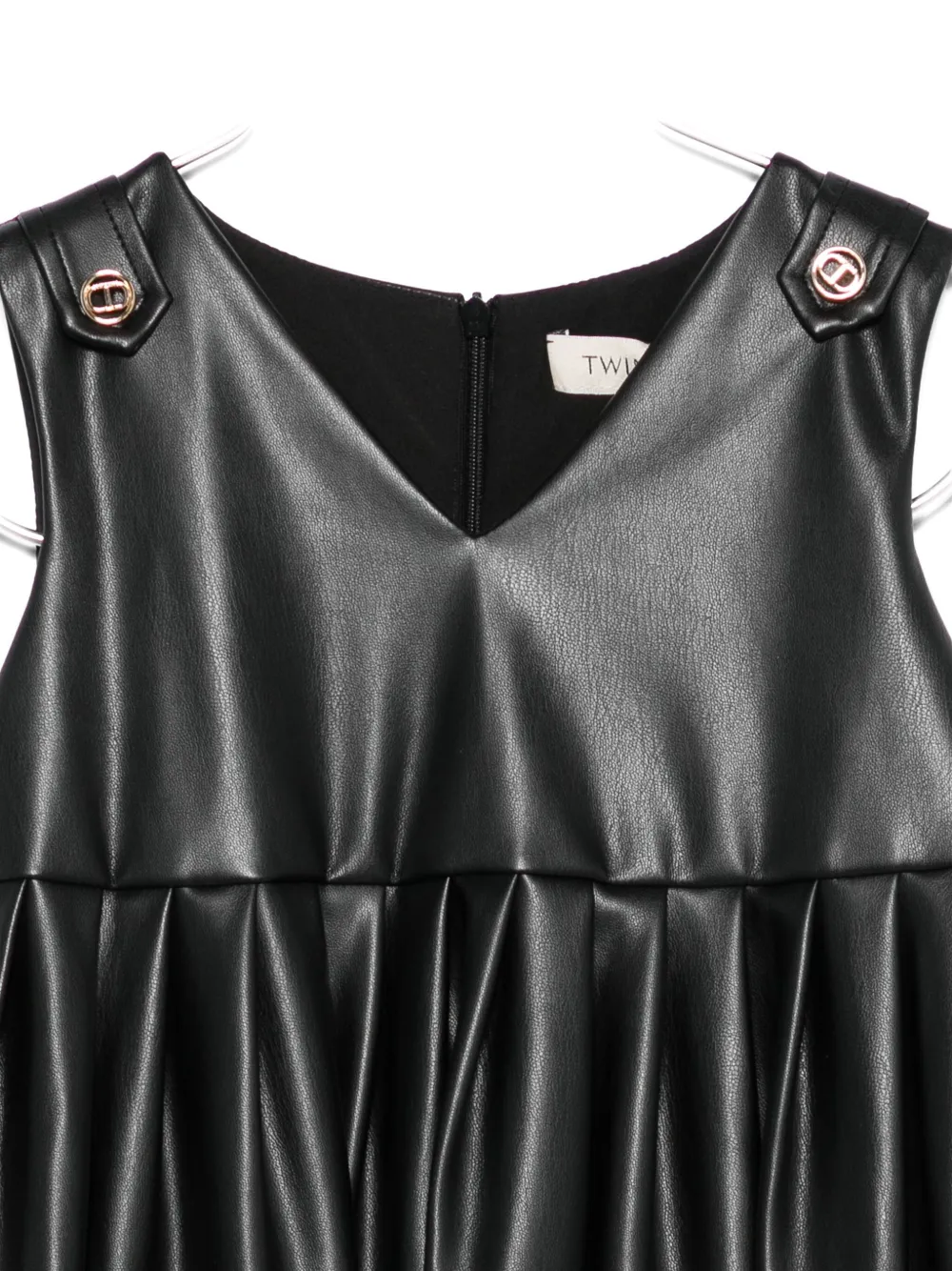 Черный кожа v-образный вырез без рукавов плиссированная юбка декор с золотистым логотипом