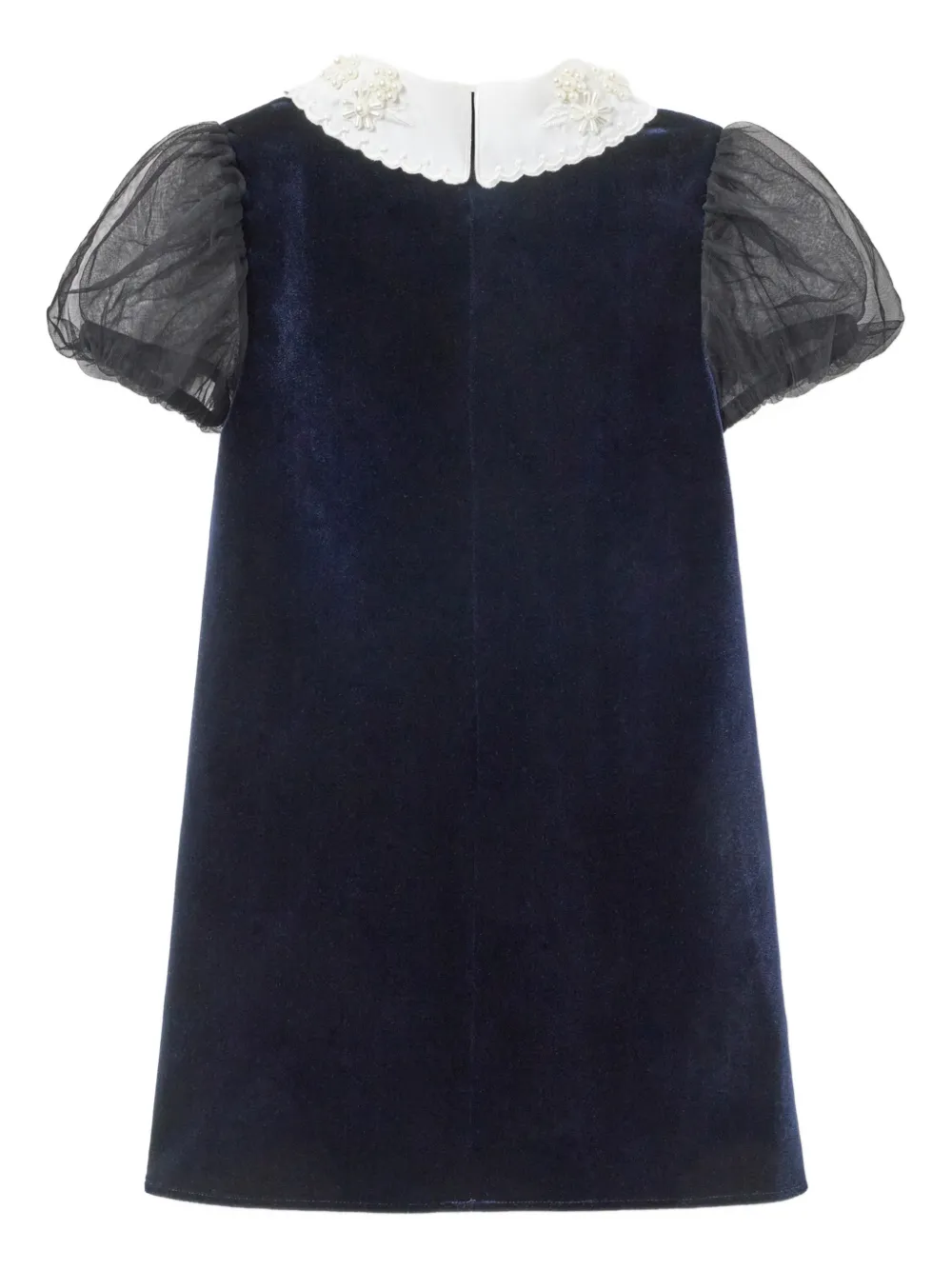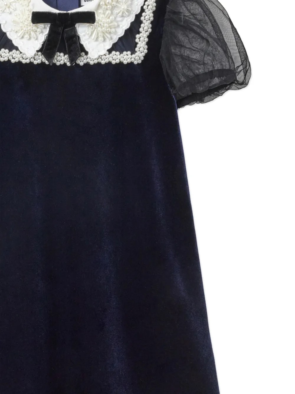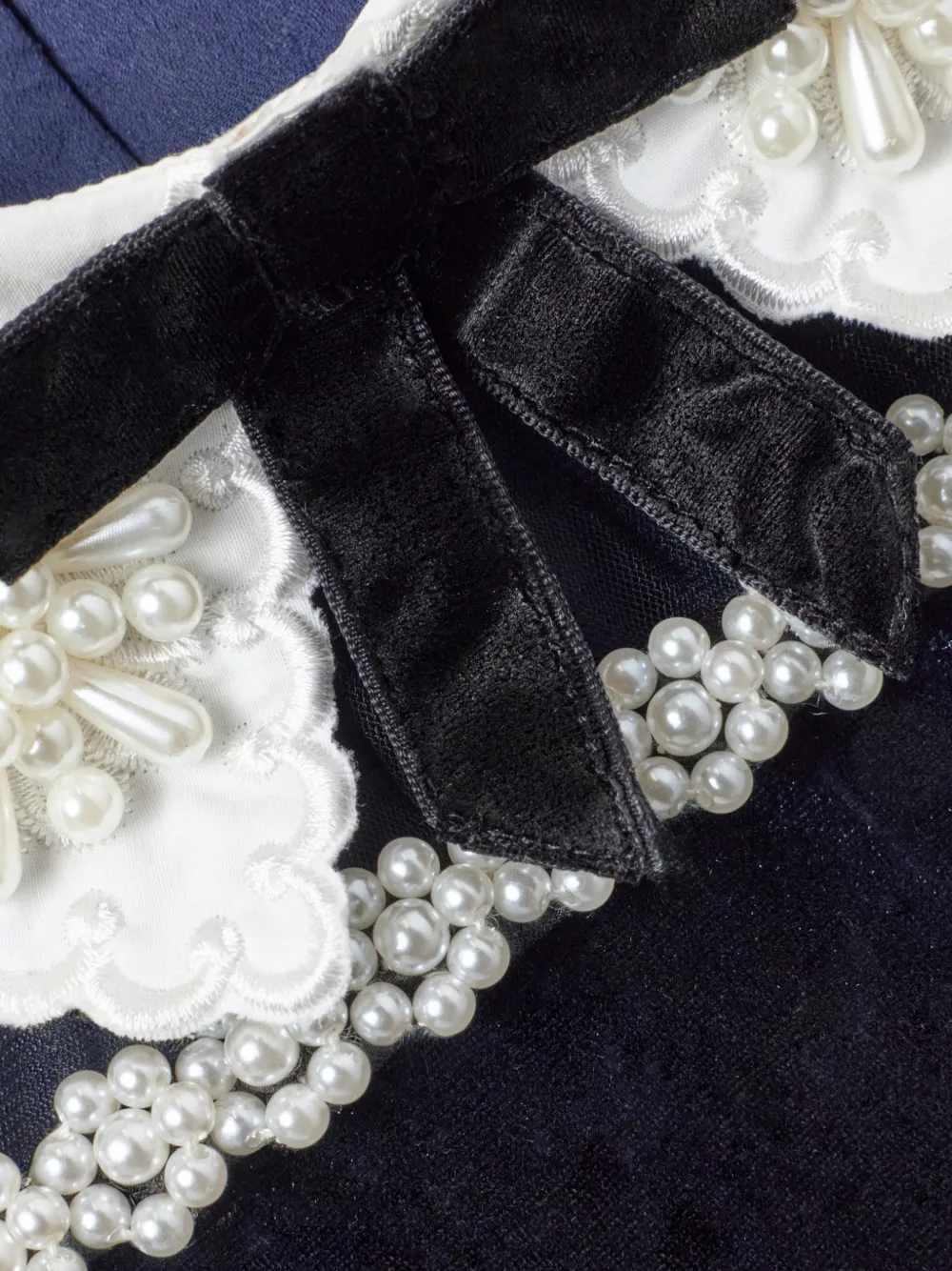 Темно-синее платье с украшением из искусственного жемчуга, бантом, остроконечным воротником, короткими пышными рукавами, бархатной отделкой и скрытой застежкой сзади