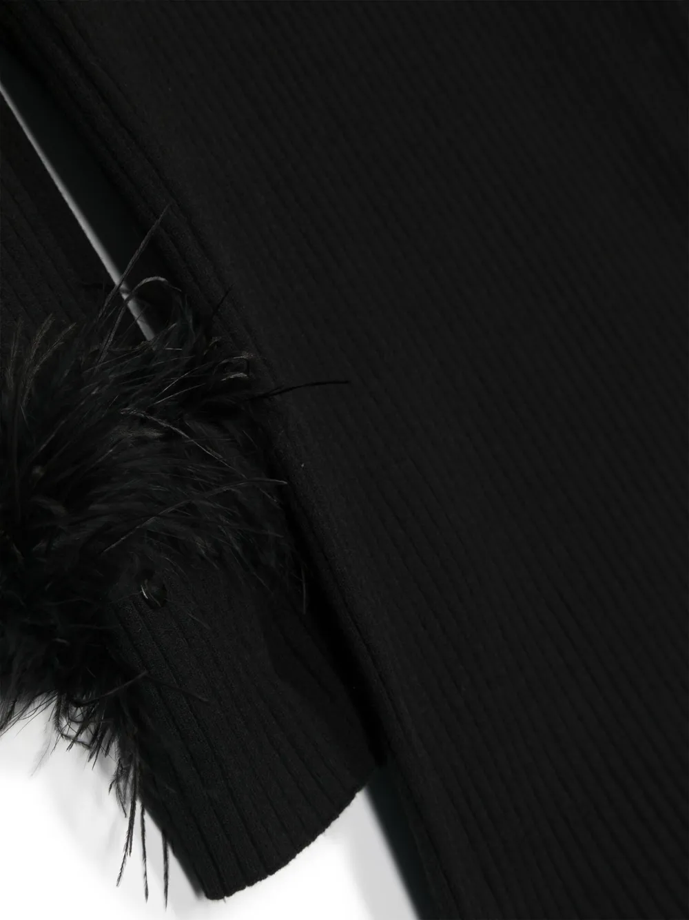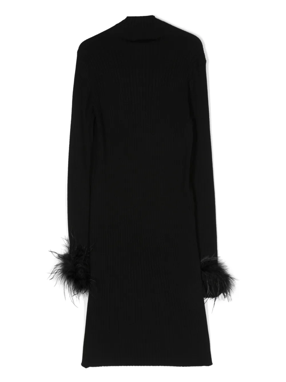 Черный, трикотаж в рубчик, серебристый металлический логотип, перья, круглый вырез, длинные рукава и прямой подол.