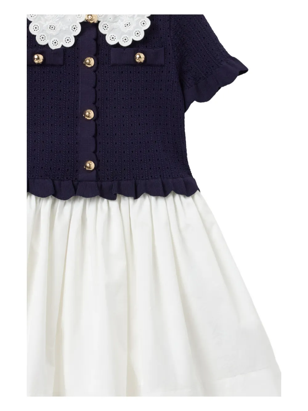 Синий кружевной воротник, пуговицы золотистого цвета, фигурная отделка, короткие рукава, юбка силуэта "А"