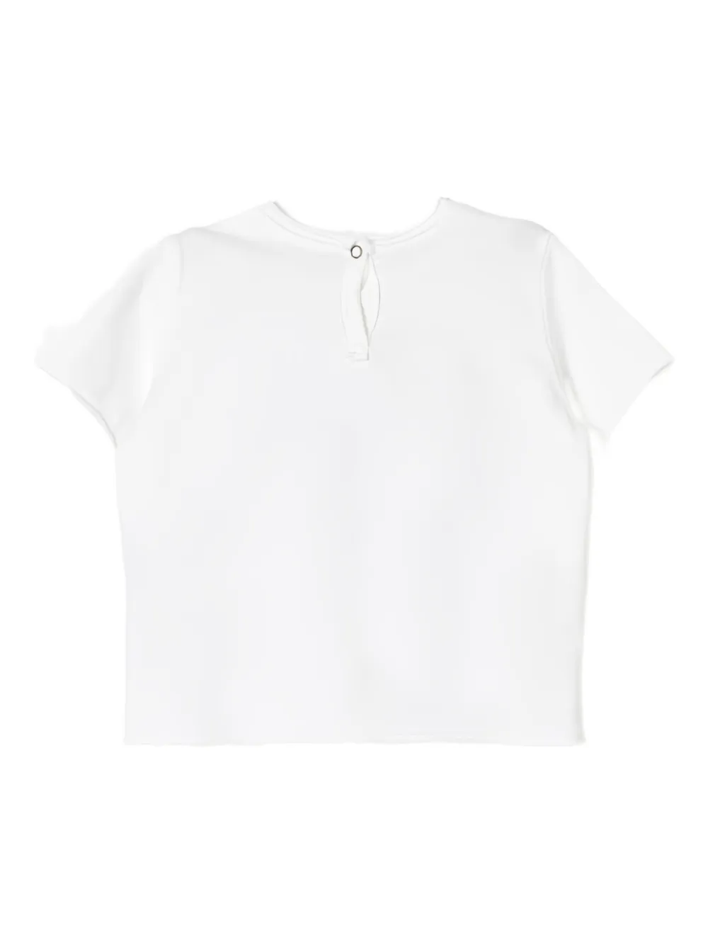 Белый цвет, круглый вырез, короткие рукава, застежка на пуговицы сзади