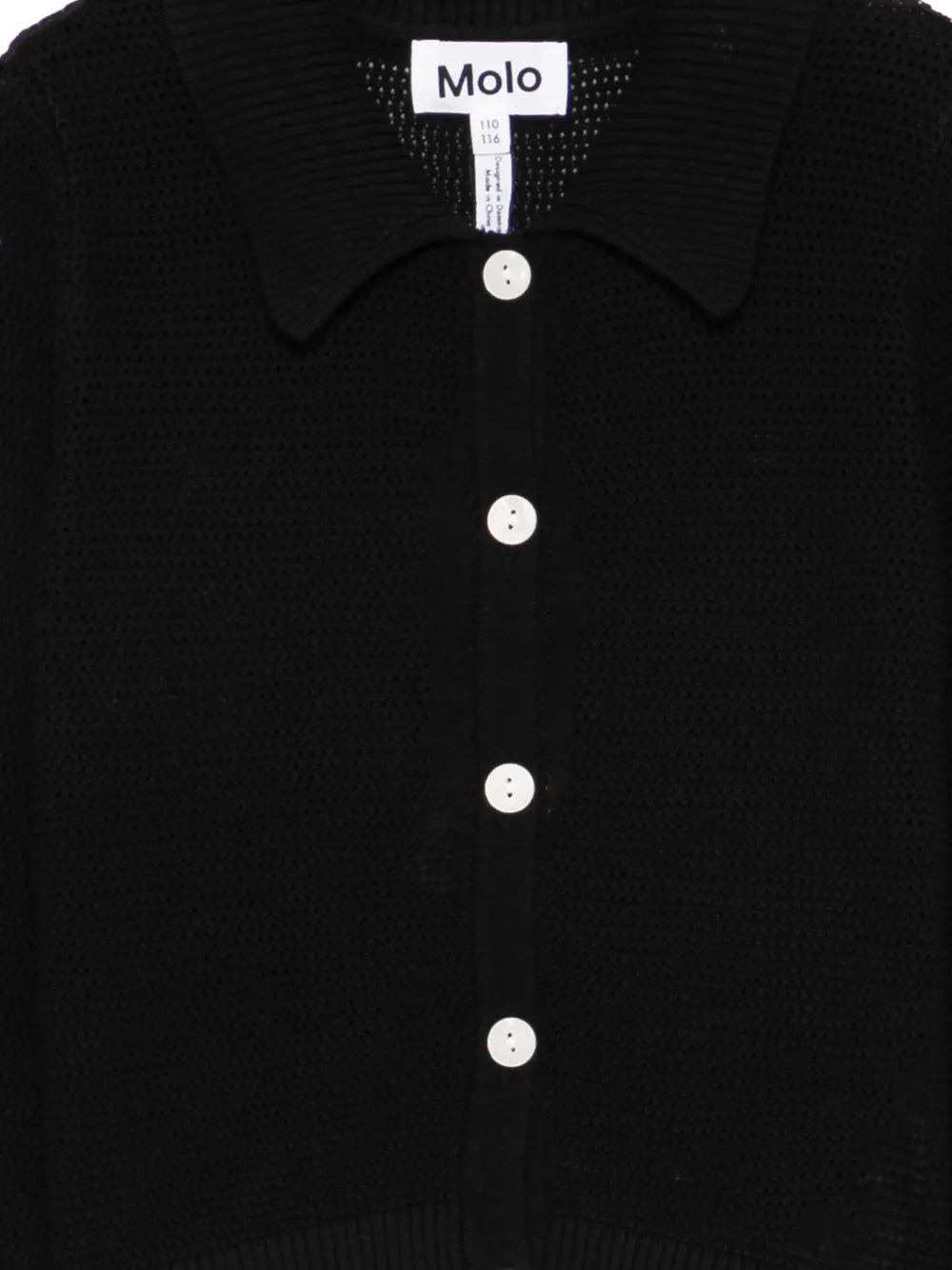 Черный ажурный джемпер с застежкой на пуговицы, длинными рукавами, воротником поло и фактурной резинкой по краю
