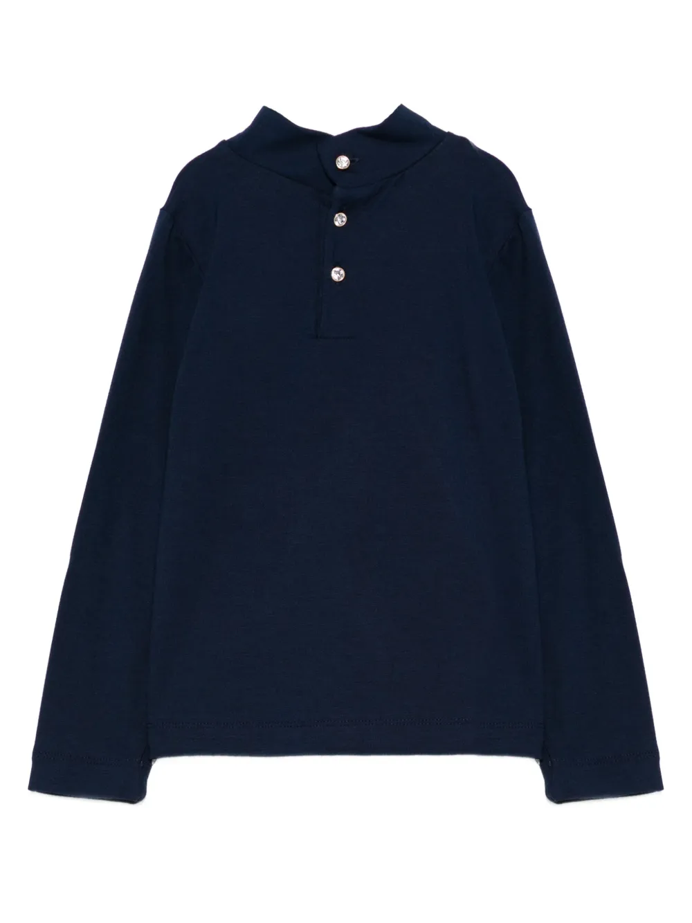Темно-синий бант на шее короткая застежка на пуговицы сзади длинные рукава высокий воротник облегающий