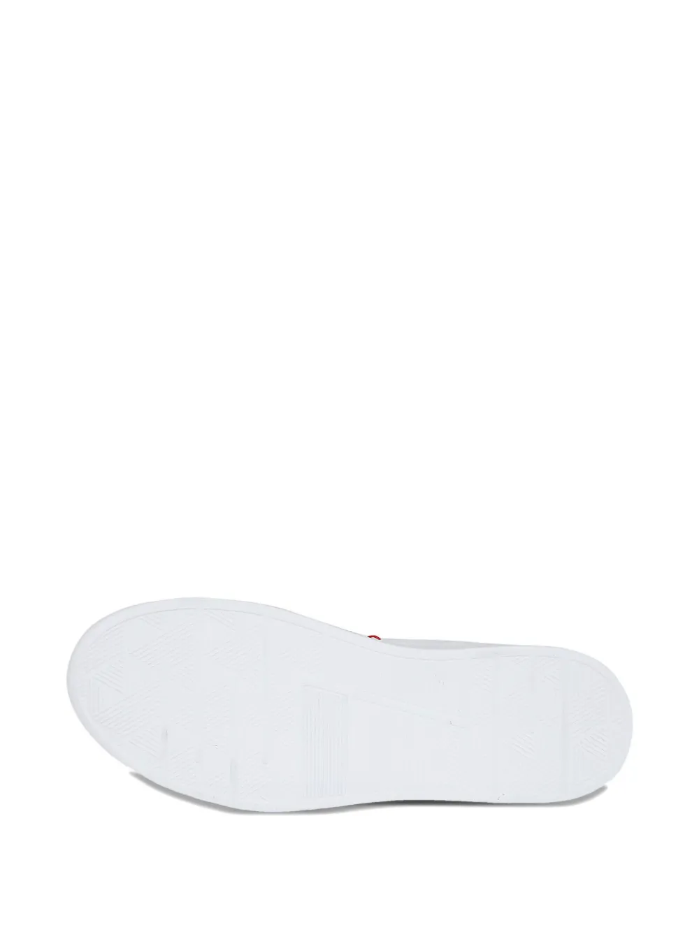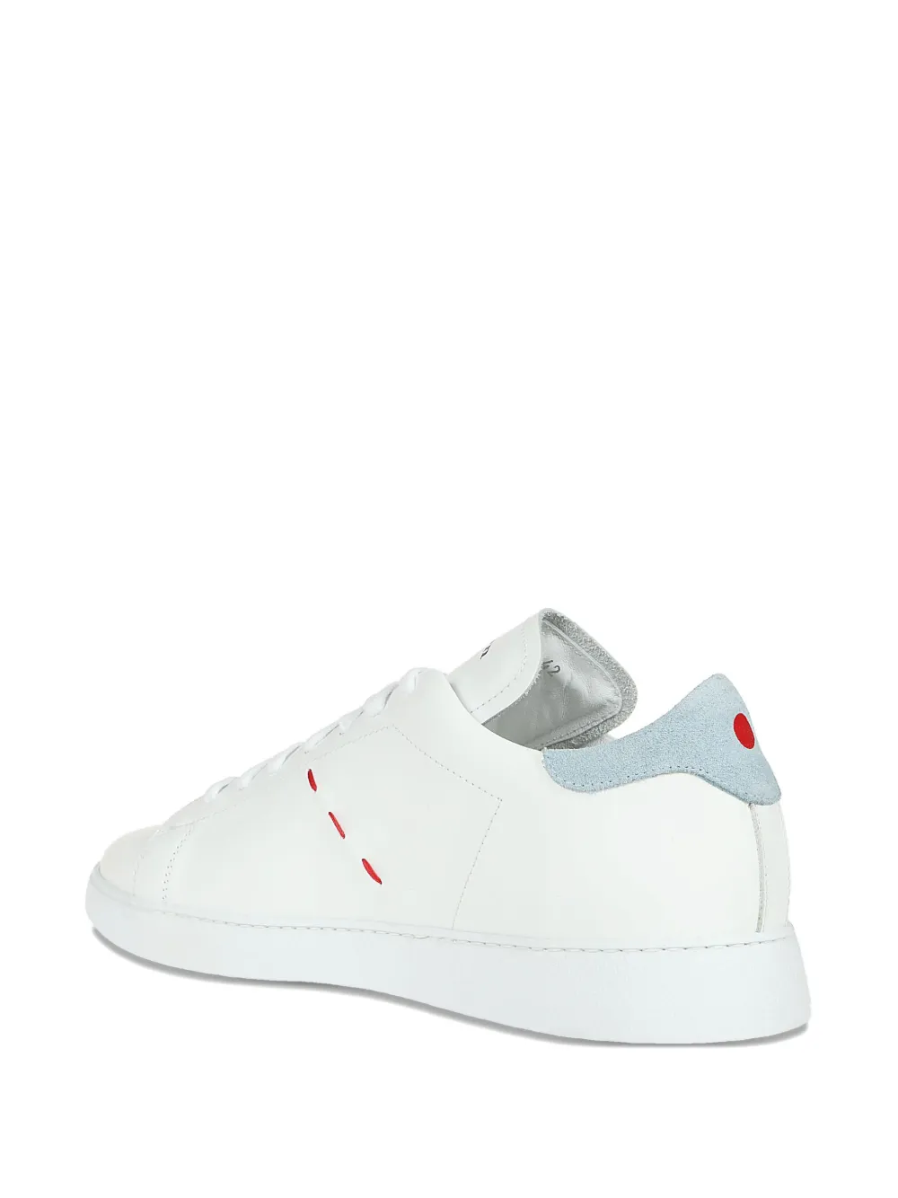 Белая телячья кожа, логотип, вставка на пятке из светло-голубого замша, детали с красной прострочкой, плоская подошва