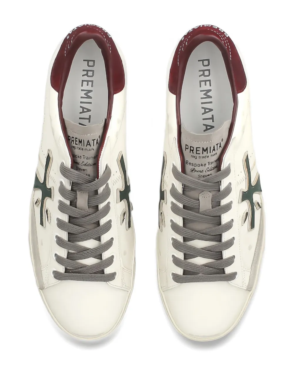 Белый кожаный верх, замшевая панель на пятке, зеленый логотип, бордовая вставка на пятке, застежка на шнуровке