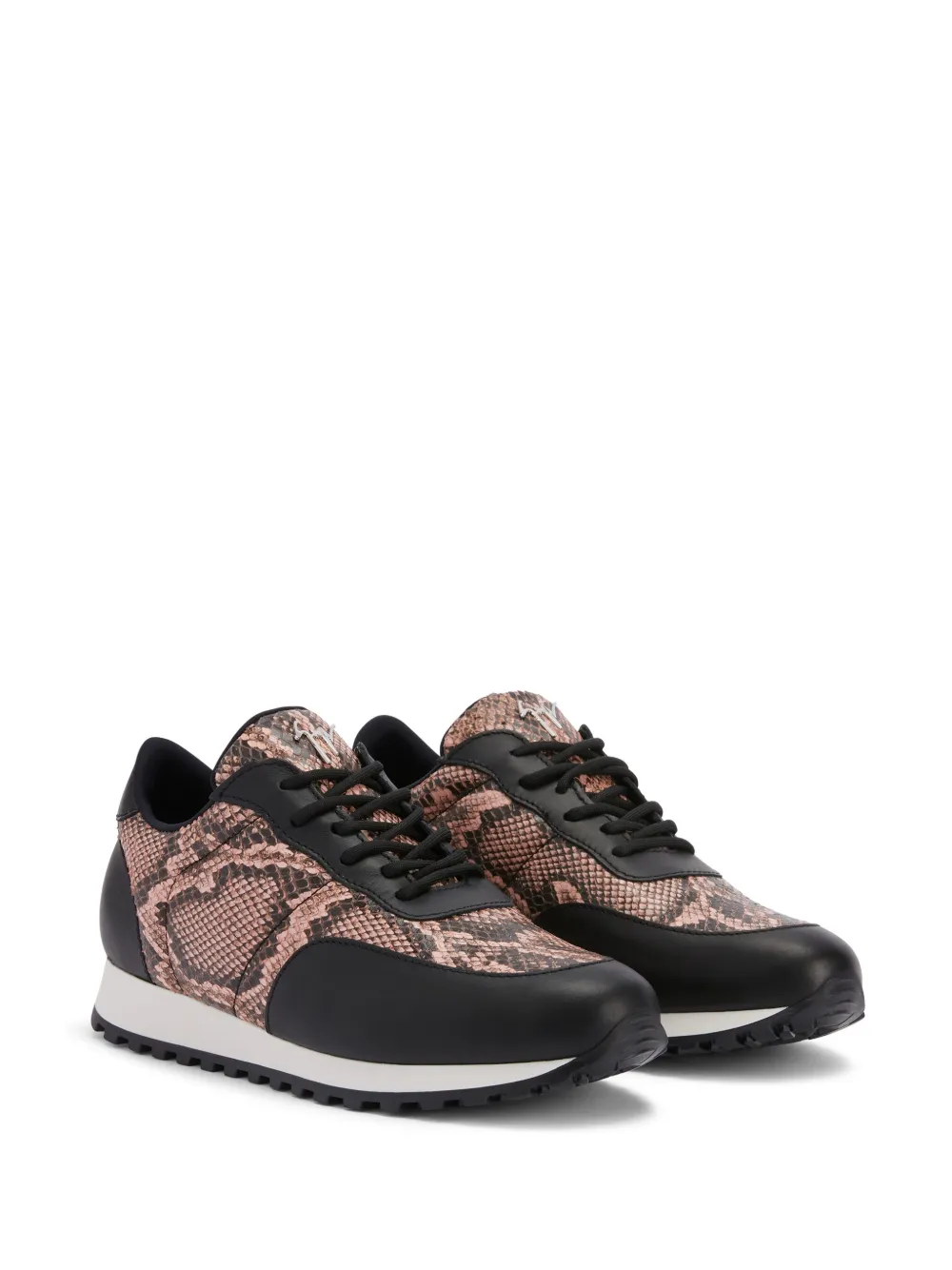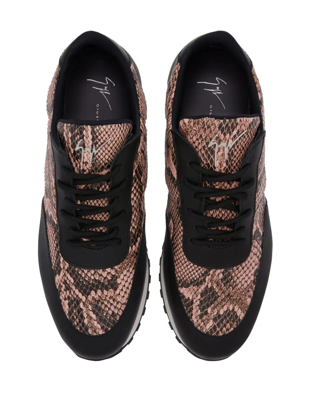 Черный, кожа, эффект змеиной кожи, вставки, металлический логотип на язычке, шнуровка спереди, миндалевидный носок, стелька с логотипом и плоская резиновая подошва.