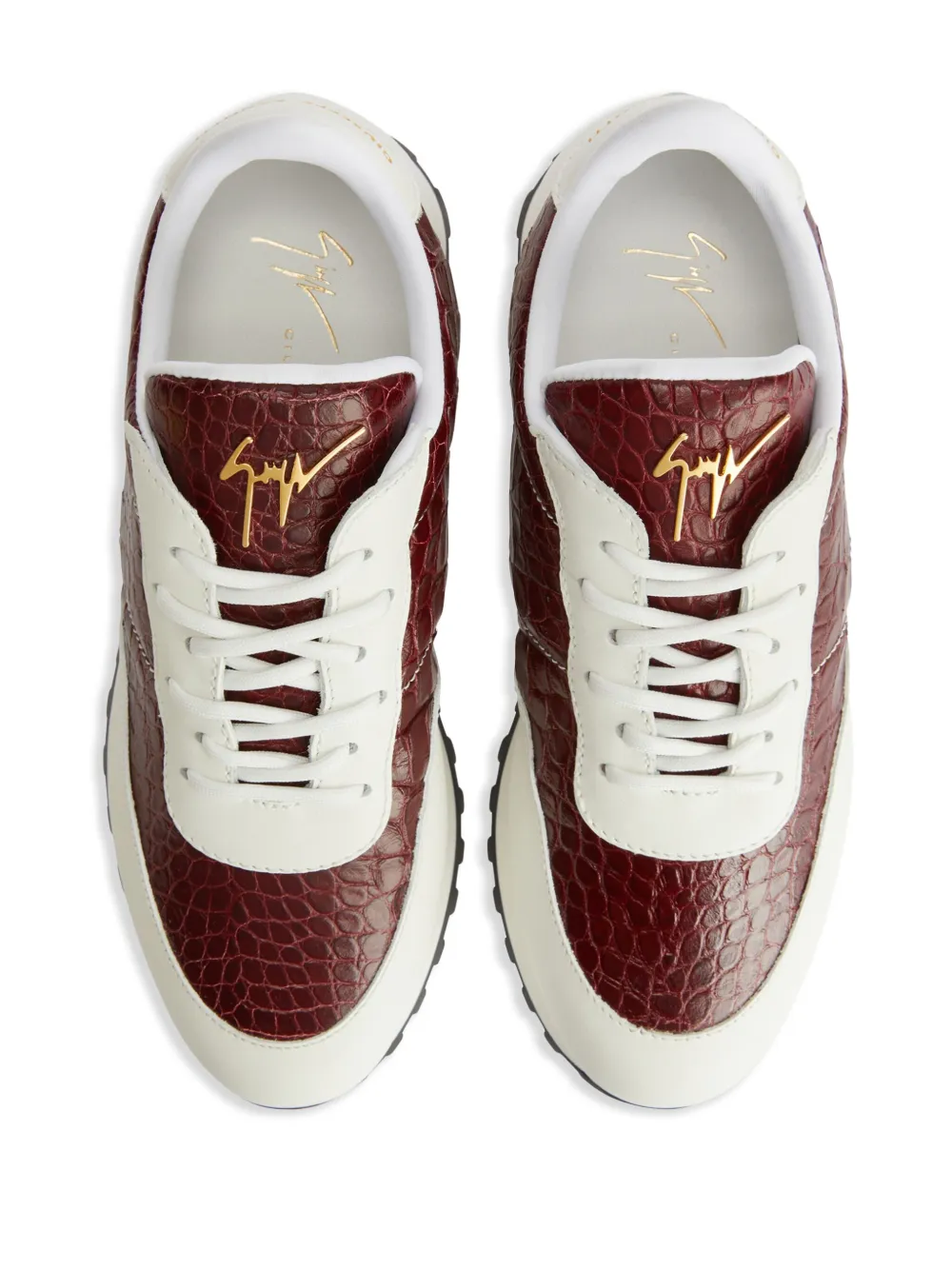 Белый, темно-красный, кожа, металлический логотип на язычке, тиснение под кожу крокодила, шнуровка спереди, вставки, миндалевидный носок, стелька с логотипом и плоская резиновая подошва.