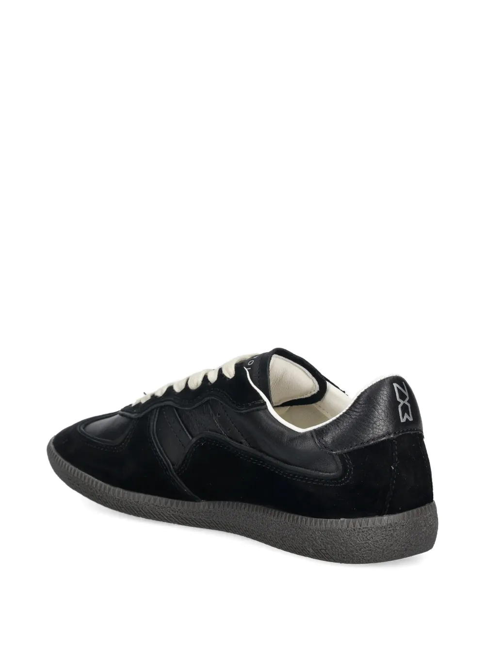 Черный цвет, панельный дизайн, детализация с логотипом, шнуровка спереди, круглый носок, плоская резиновая подошва