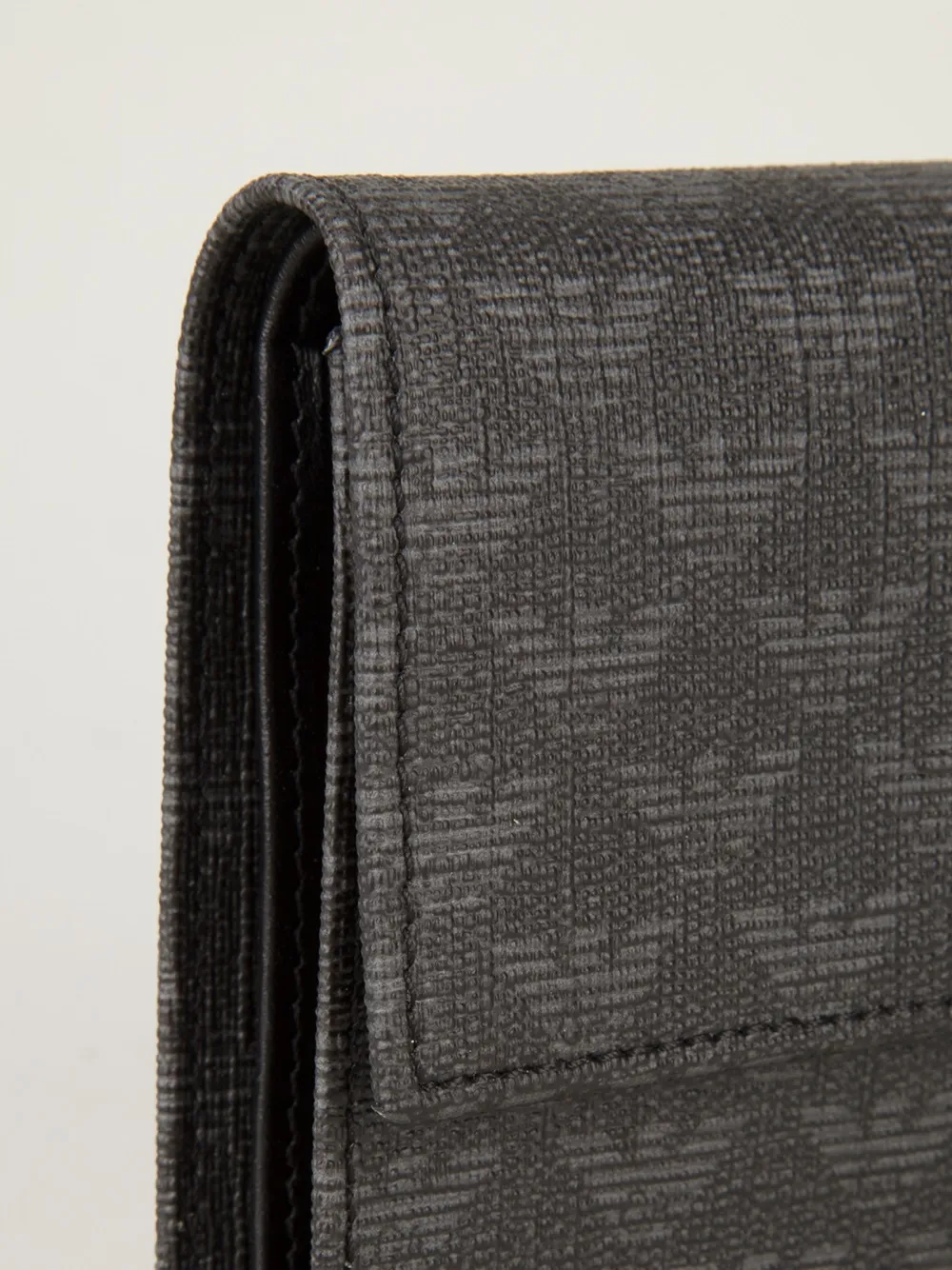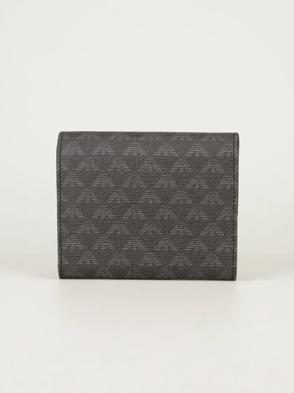 Серый кожаный бумажник с логотипом от Emporio Armani. Застежка с клапаном спереди, монограммный узор, магнитная застежка, отделение для купюр, несколько отделений для карточек.