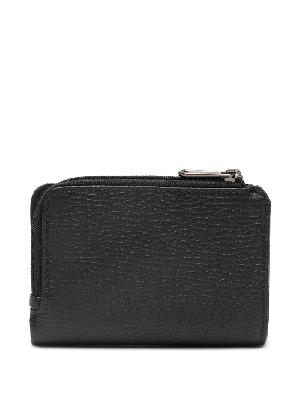Черный цвет, зернистая фактура, застежка на молнии, деталь с логотипом, внутренние слоты для карт, застежка на кнопку