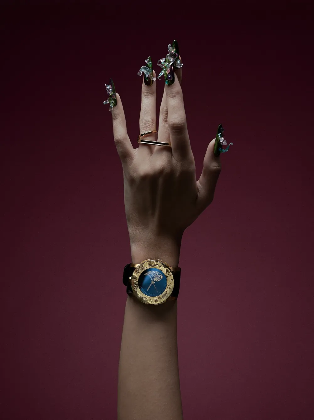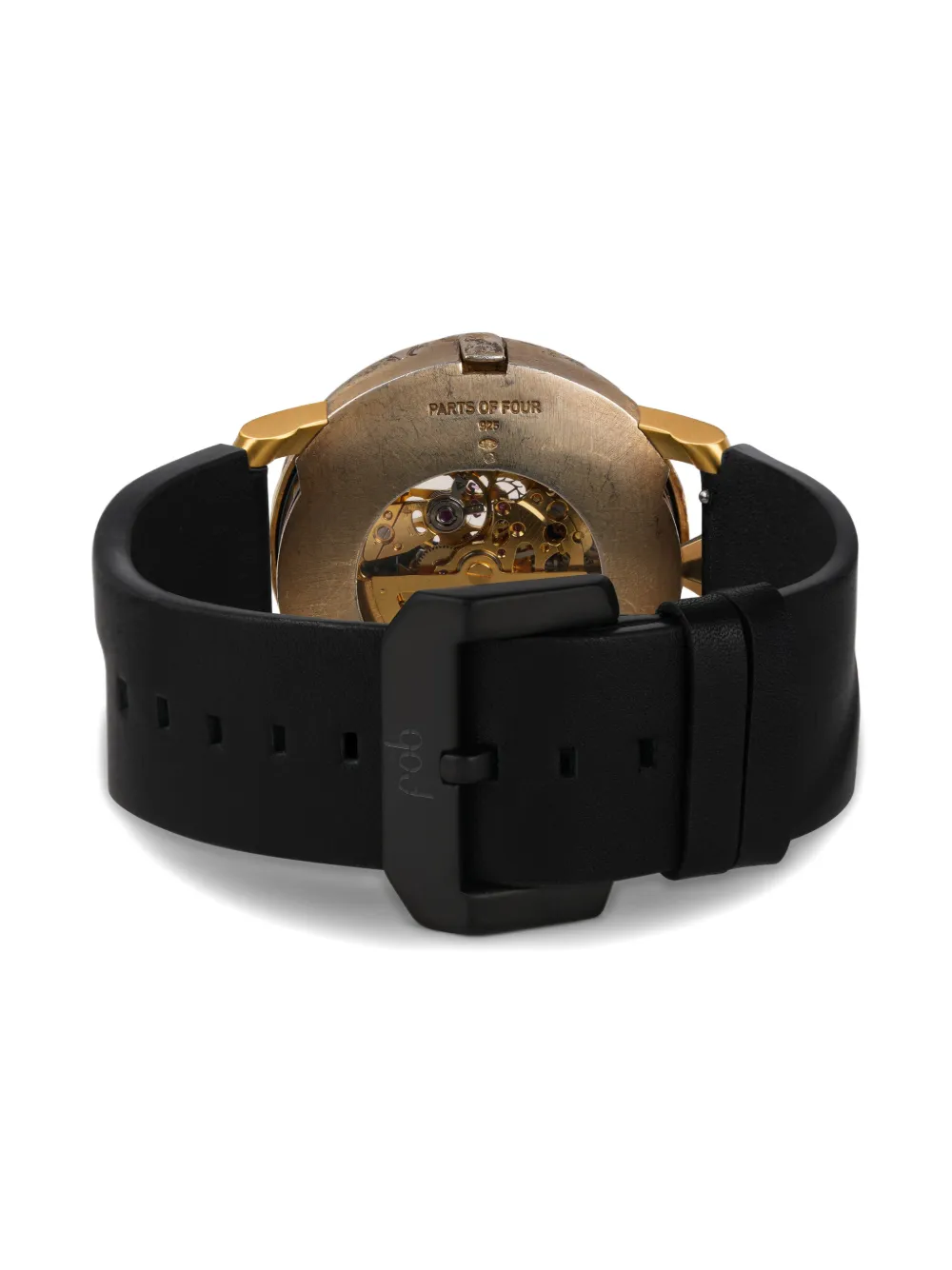 Золотой круглый корпус, черный циферблат, открытое окошко механизма, черный ремешок, застежка-пряжка, автоматический механизм