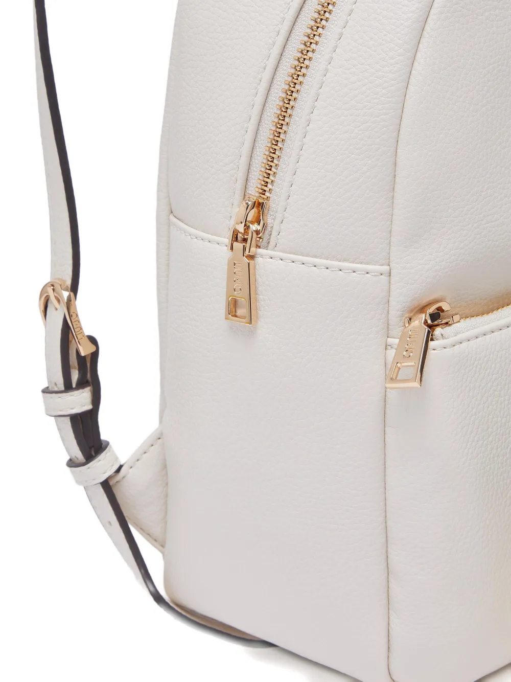 Кремовый цвет, зернистая фактура, передний карман на молнии, фирменный логотип, регулируемые плечевые ремни, декоративная подвеска, одна верхняя ручка