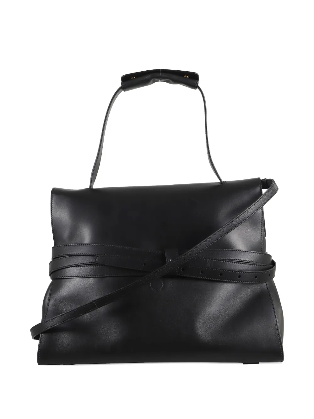 Черная сумка с верхней ручкой, клапаном, пряжкой-ремнем, фурнитурой золотистого оттенка и плечевым ремнем