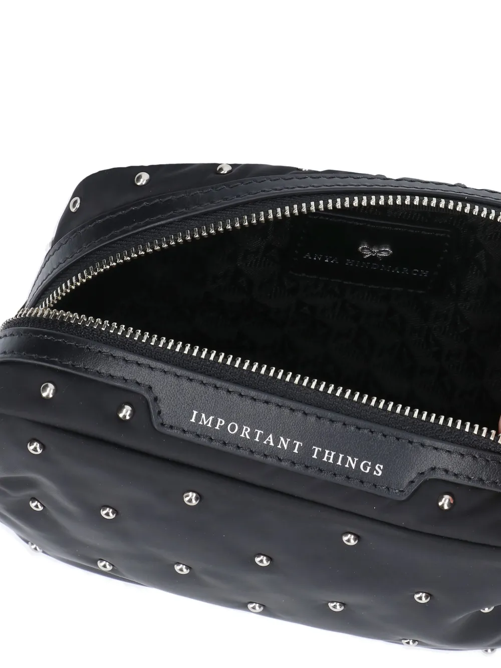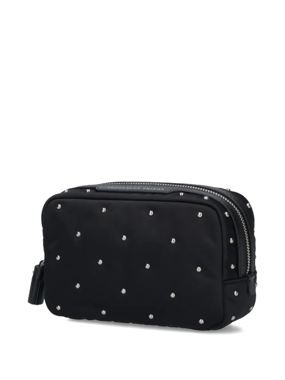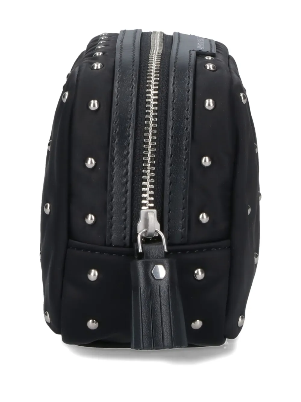 Черная сумка с заклепками, застежкой-молнией, декоративной кисточкой, надписью и внутренней нашивкой с логотипом