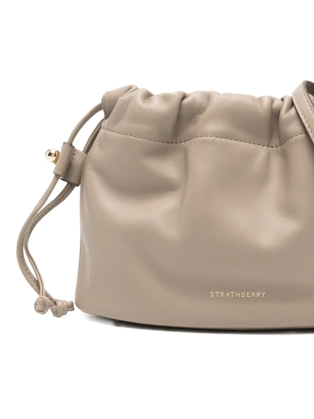 Топ цвета серо-коричневый (тауф) со сборкой, лямкой на плечо, застежкой на кулиску, фурнитурой золотистого цвета, с буквенным логотипом