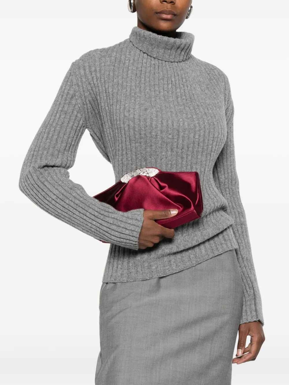 Шелковый клатч с застежкой-кнопкой, украшенный ювелирным аксессуаром с инкрустированными кристаллами и внутренней кожаной ручкой. Внешний материал: 72% вискоза LENZING, 28% органический шелк.