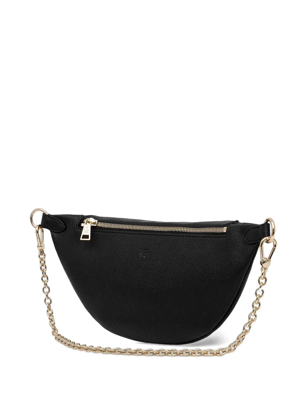 Черная сумка с застежкой-молнией, цепочкой, фурнитурой золотистого оттенка и длинным ремнем через плечо. В комплекте идет защитный мешочек для хранения.