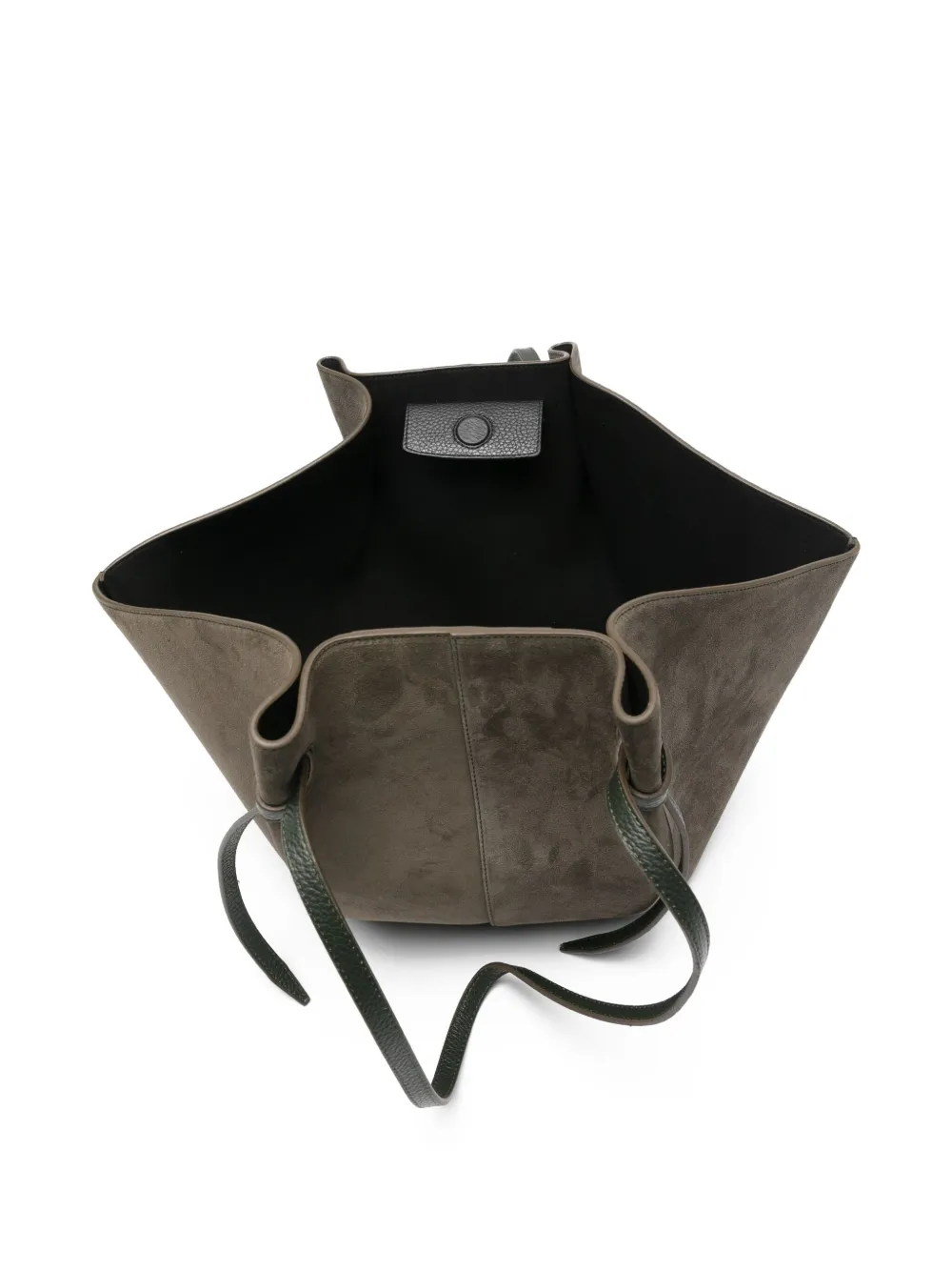 Темно-зеленый замшевая текстура длинные верхние ручки деталь с завязками внутренний карман открытый верх
