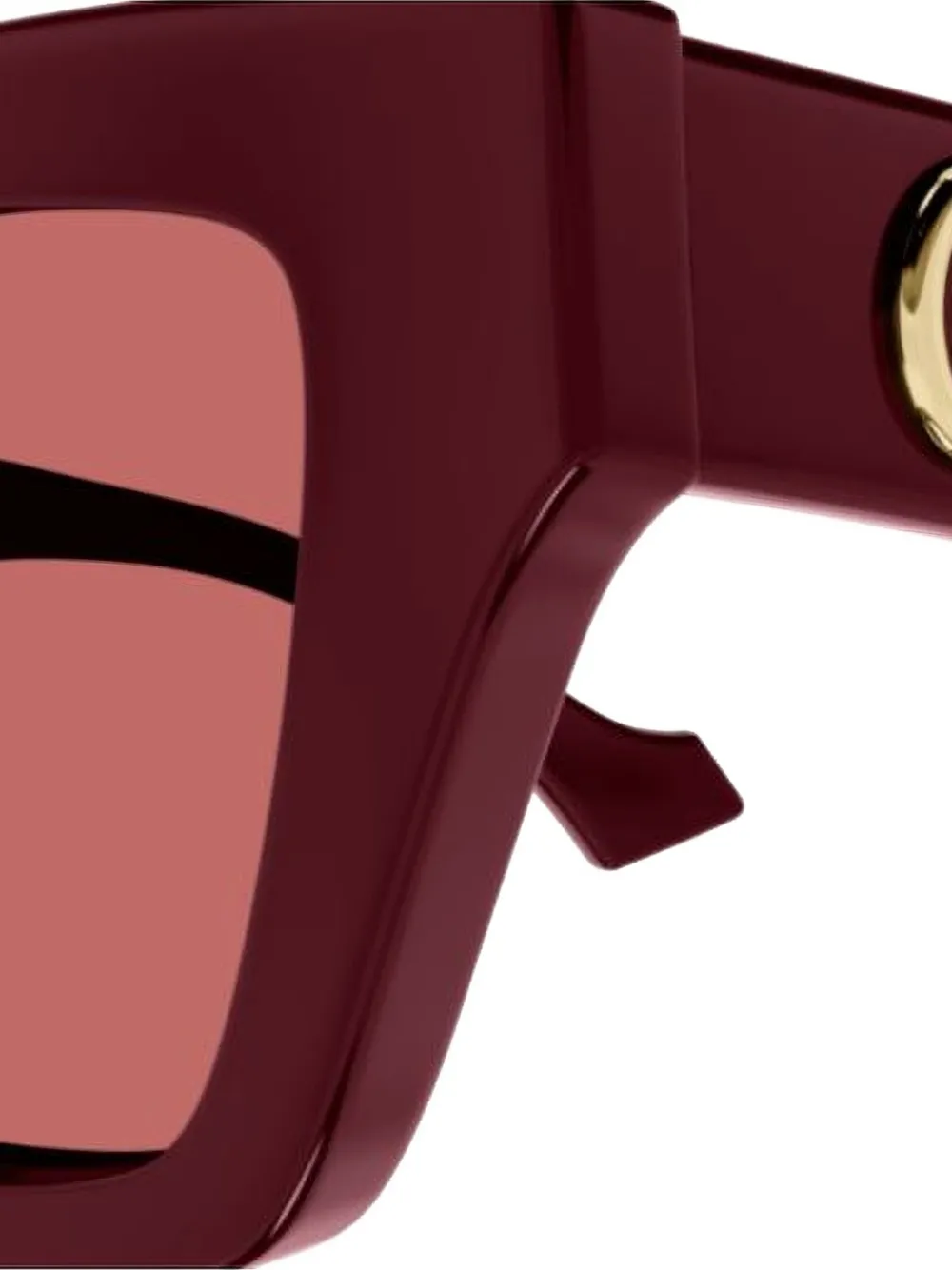 Бордовые тонированные линзы, фирменный логотип Double G, геометрическая оправа, изогнутые дужки. В комплекте защитный футляр.