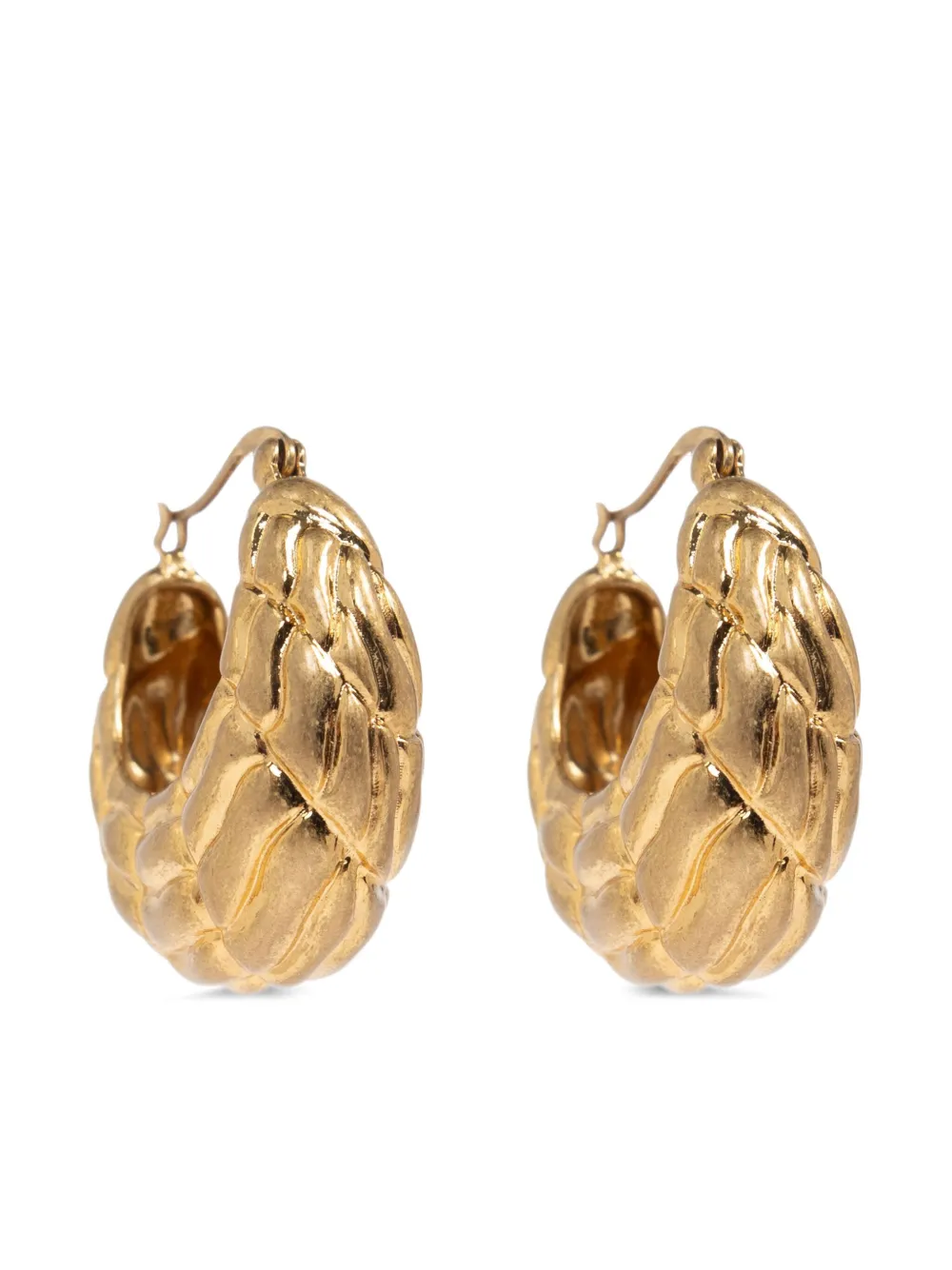 Золотистого оттенка, дизайн в виде кольца, текстурированная отделка. Эти серьги продаются в паре.